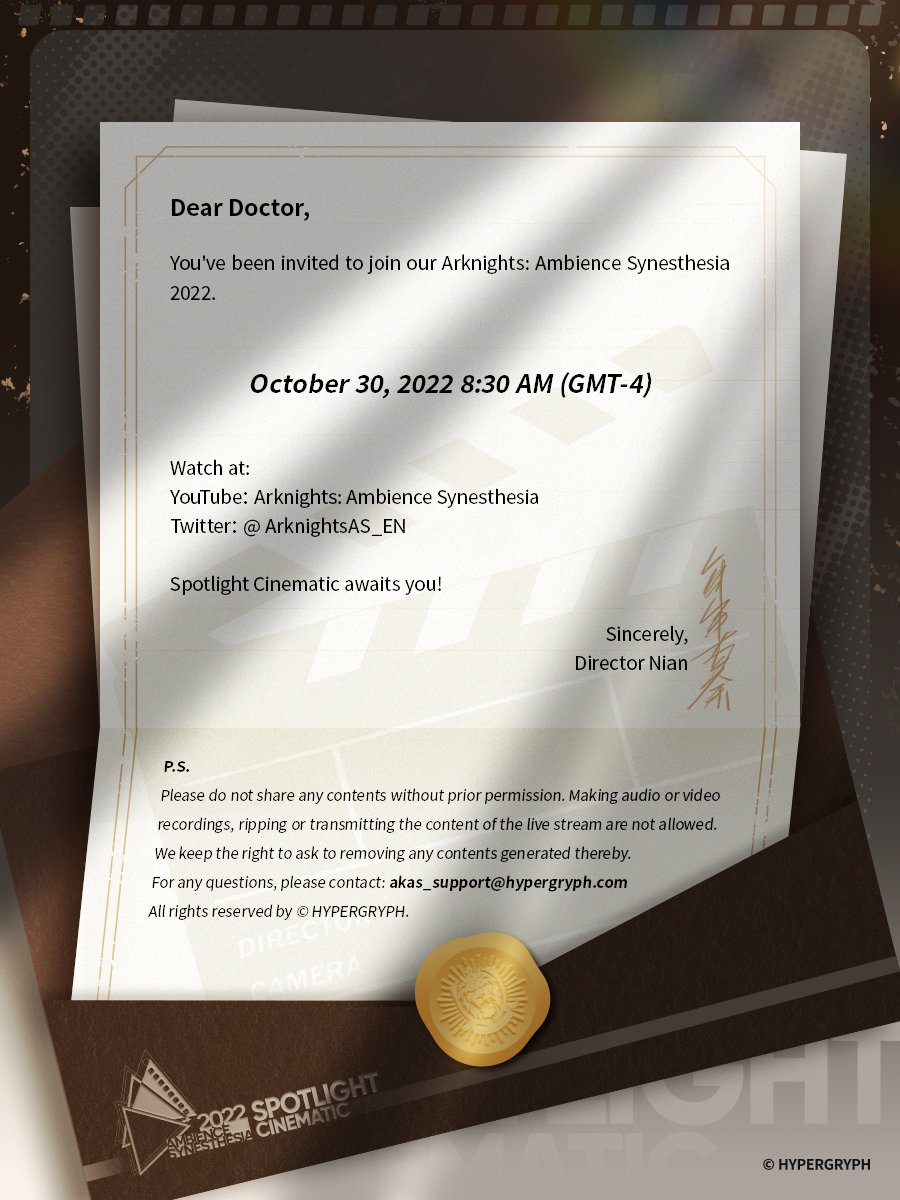 Arknights: Ambience Synesthesia 2022 is going live on 30th Oct on Twitter and YouTube, and you've been invited to join us!