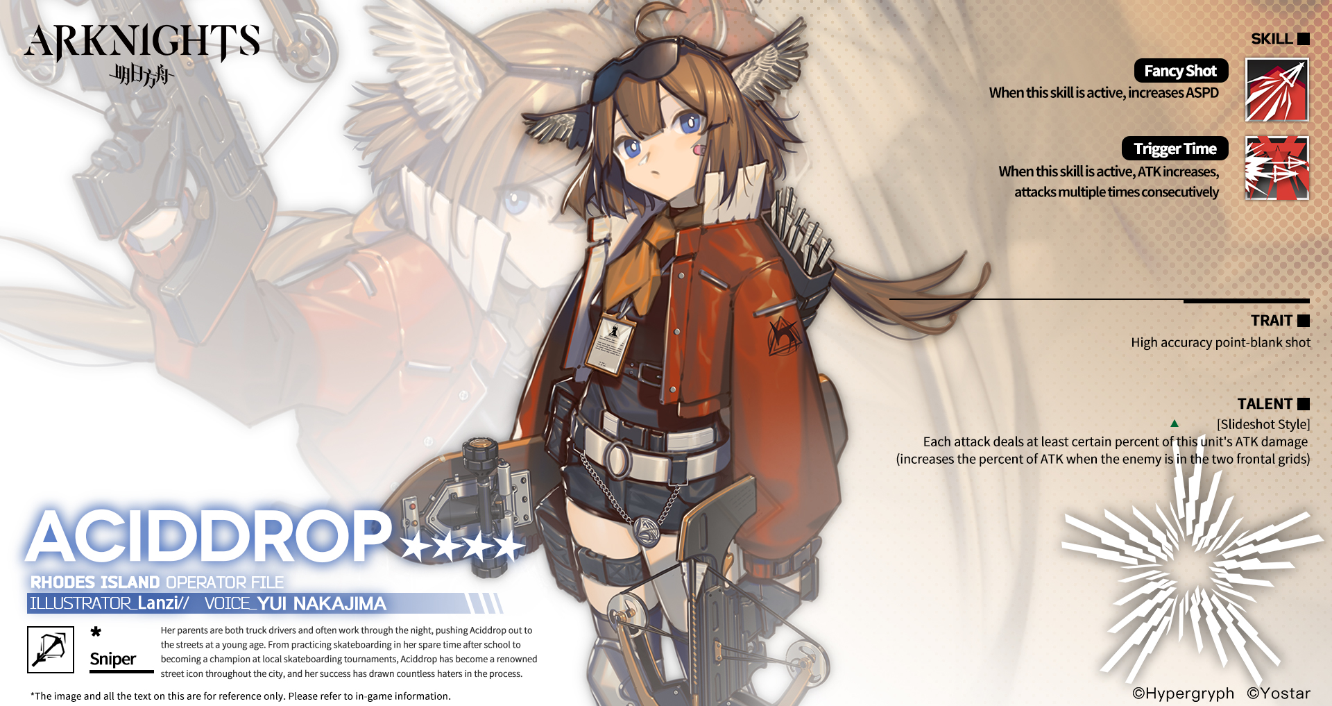 A street girl of Columbia, born to a normal working-class family. During a deliberate fight, Aciddrop was infected with Originium dust, later coming to Rhodes Island to seek treatment.