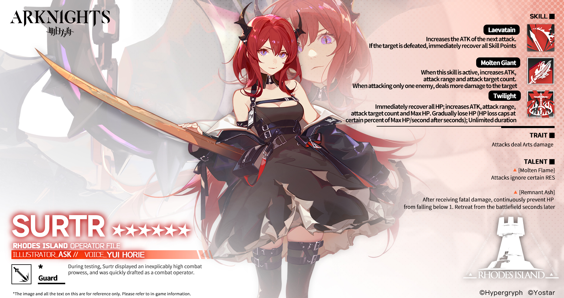 Surtr is a mysterious Sarkaz girl who suffers from amnesia, perhaps due to her Oripathy. Her condition is rarely seen even among Infected. She is currently undergoing treatment at Rhodes Island.