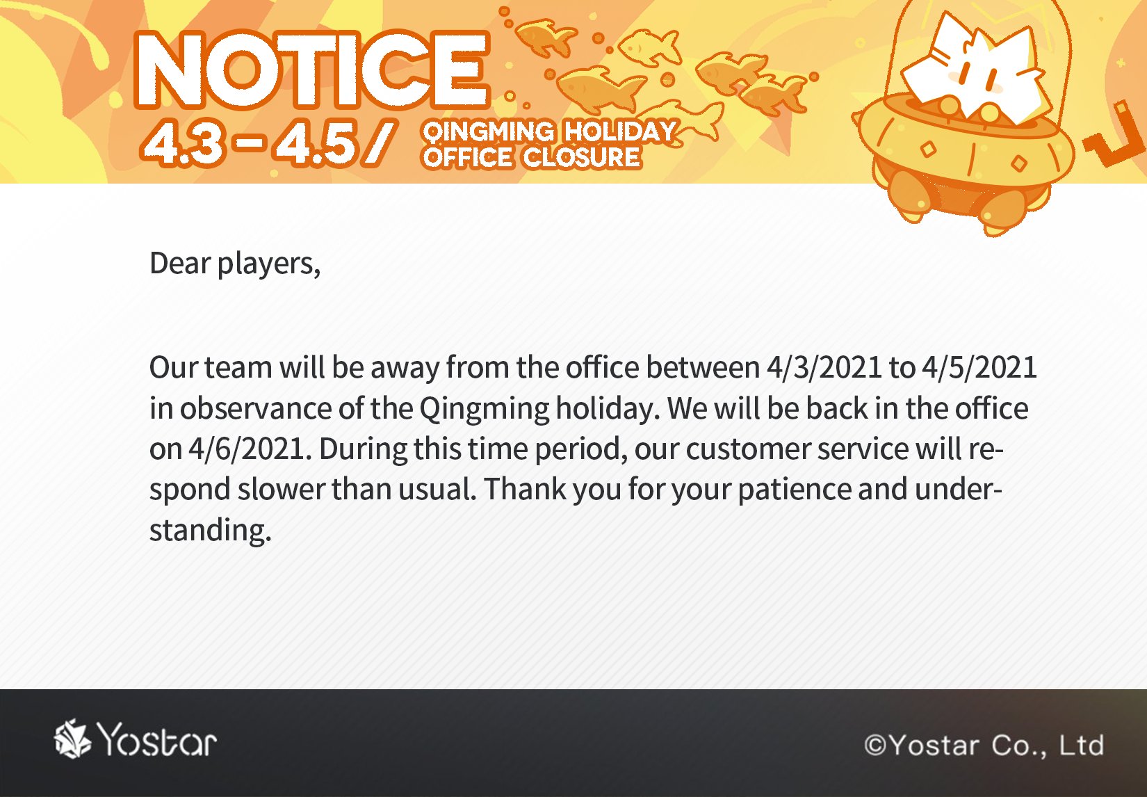 Please note that we will be away from the office from April 3 to April 5. Our customer service team will be on duty. Thank you for your understanding.