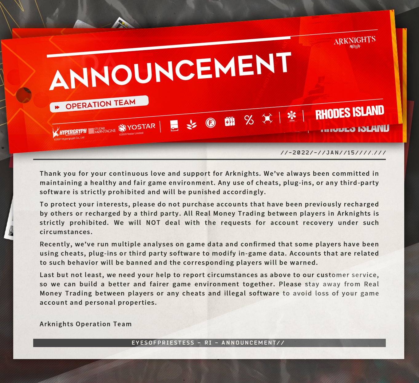 Recently, we noticed that some players have been using cheats, plug-ins, or third-party software to modify in-game data. Accounts related to such behavior will be banned and the corresponding players will be warned. Thank you for your support.