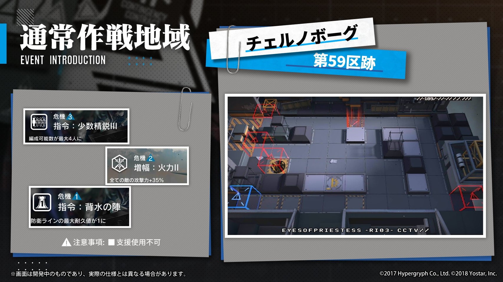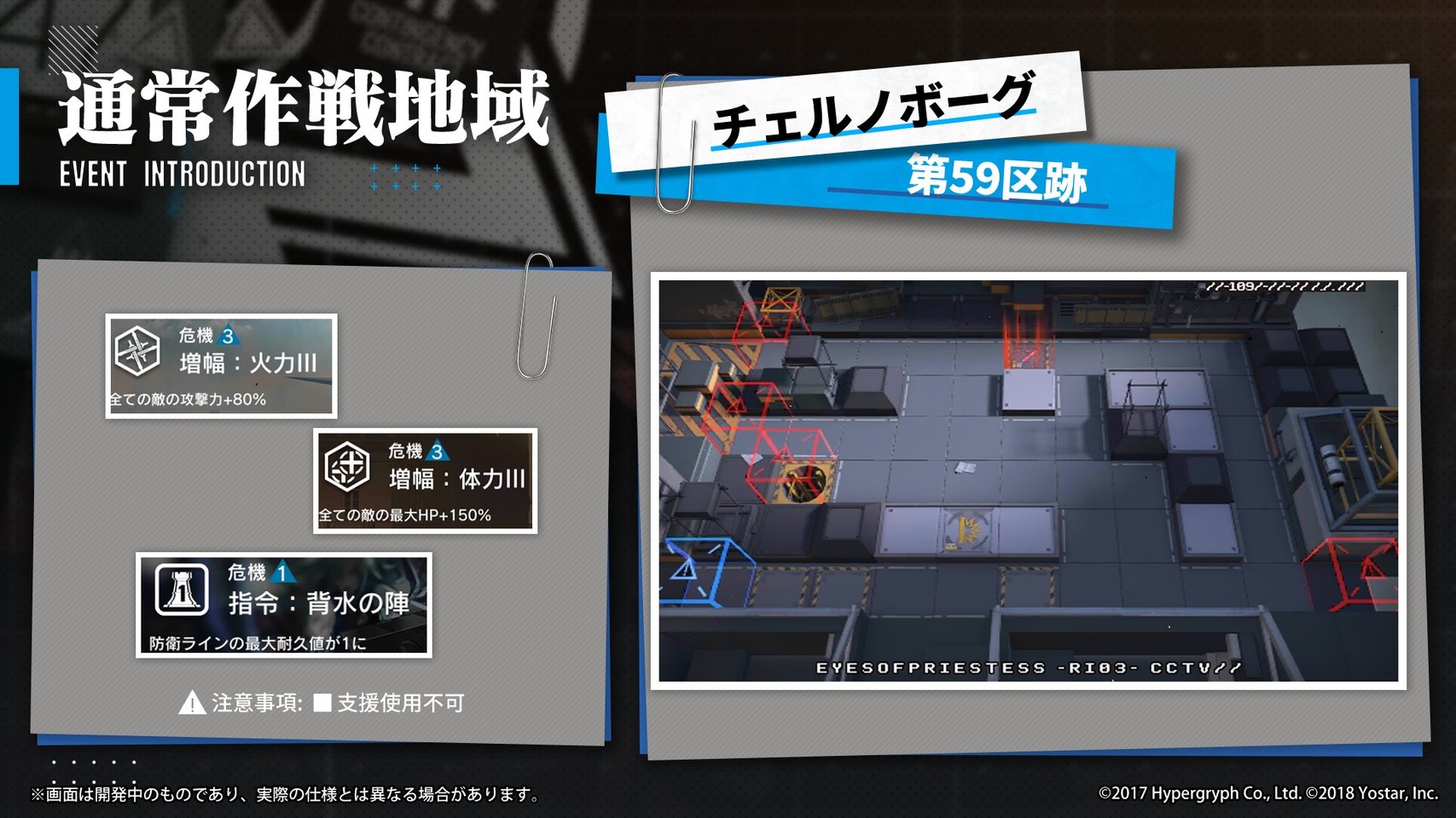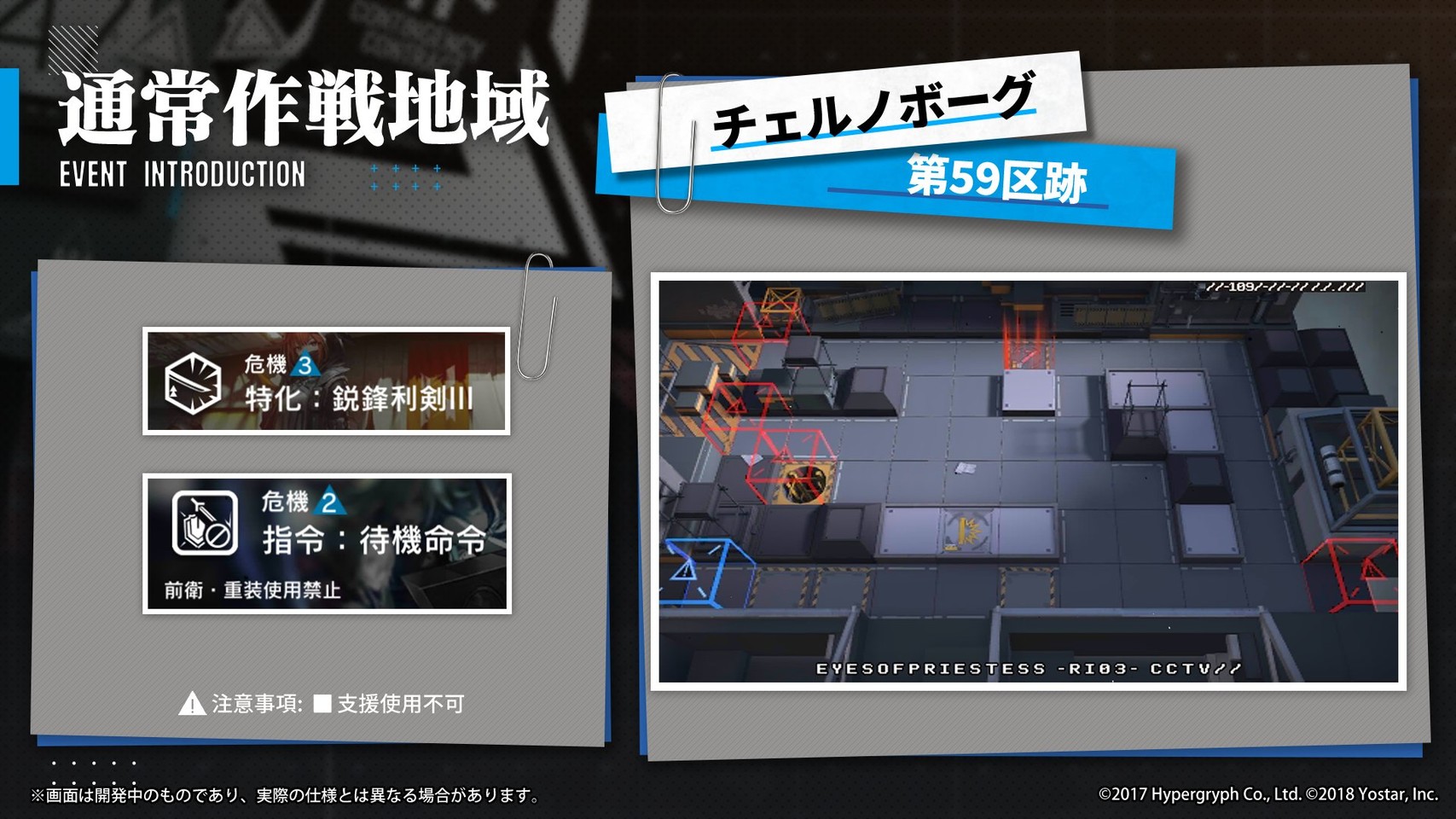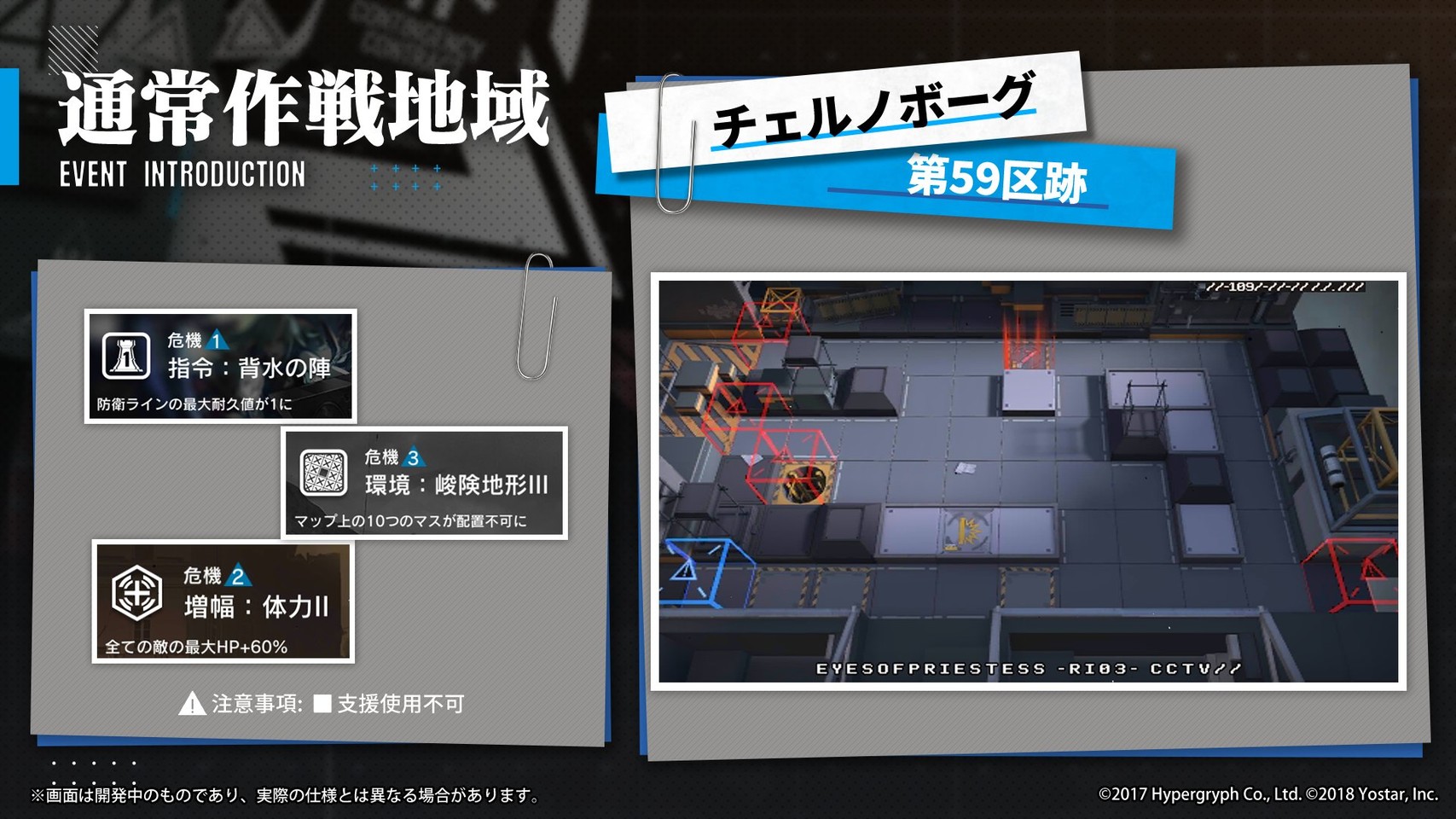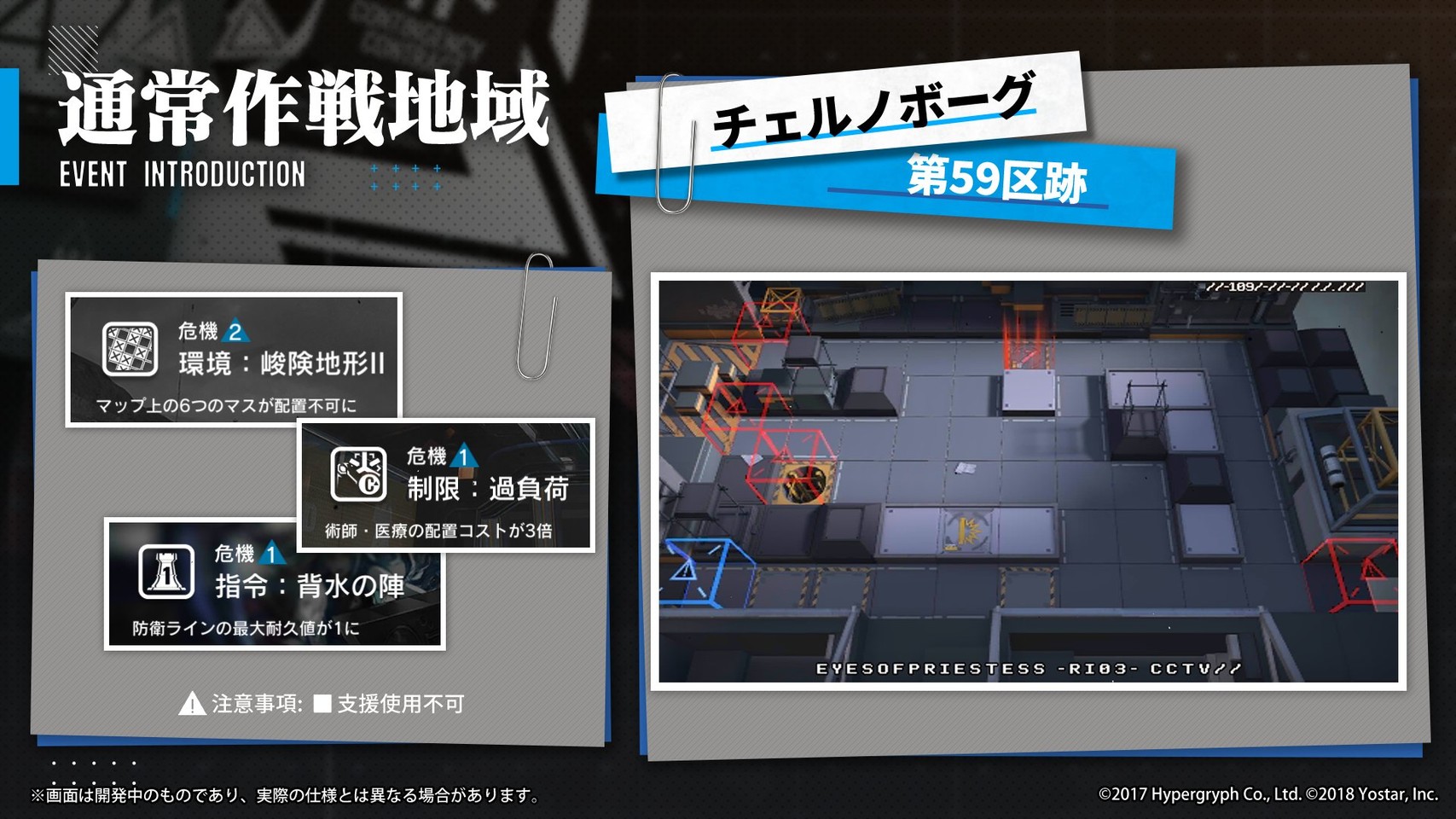 前衛・重装オペレーターの編成が禁止された戦場で、「あの強敵」を特化する「契約」を結んで「第59区跡」を突破しなければいけません。