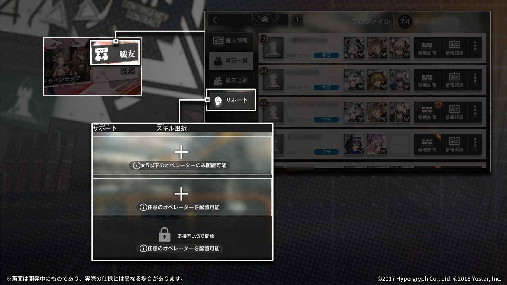 自身の編成に昇進2のオペレーターを1名連れていれば、レベルとスキル特化状況はそのままに、戦友のサポートオペレーターを戦場へ連れて行けます。