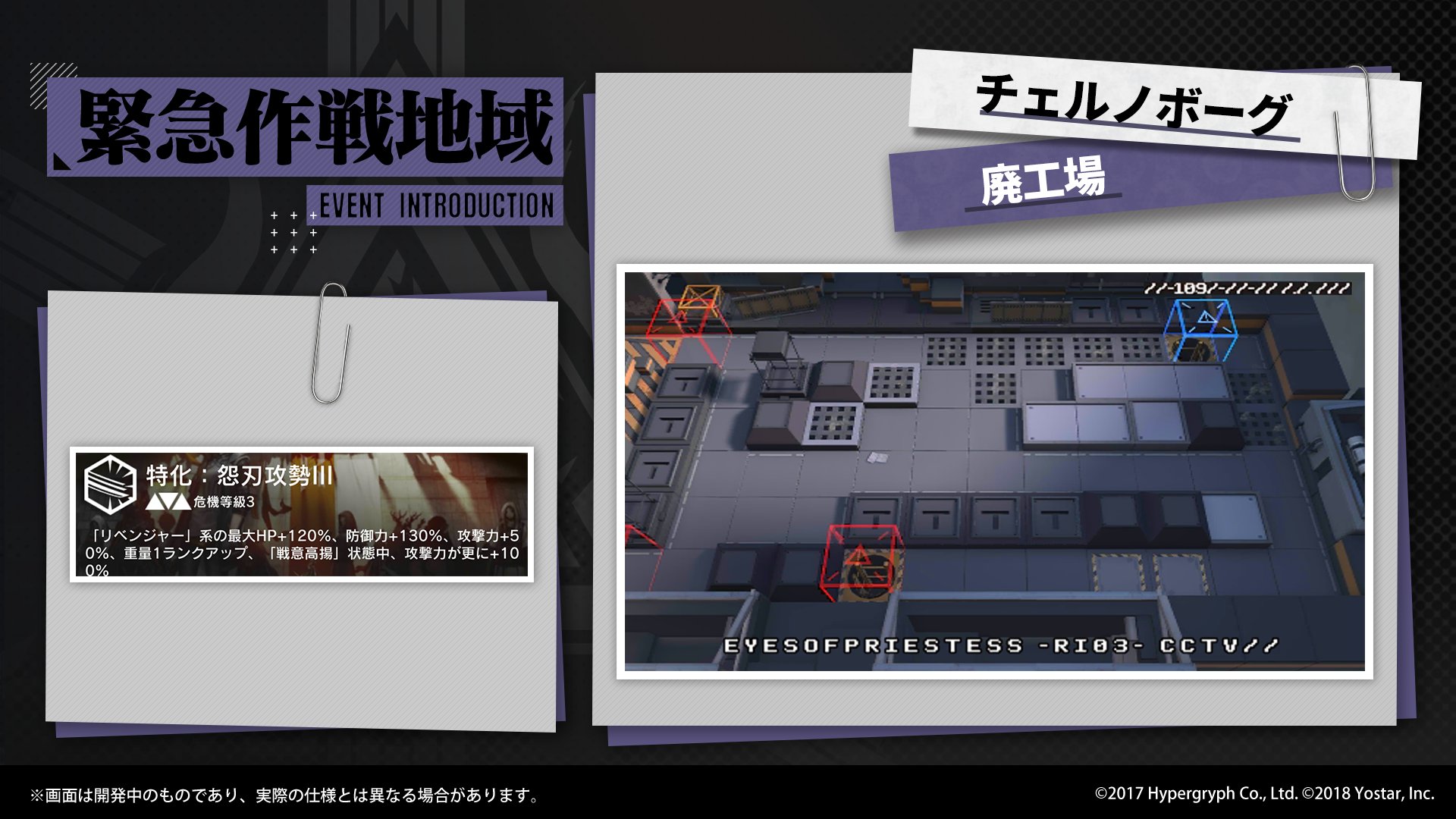 現在の「緊急作戦地域」では、特定の敵を特化する「契約」を結んだ状態で「廃工場」を突破する任務があります。