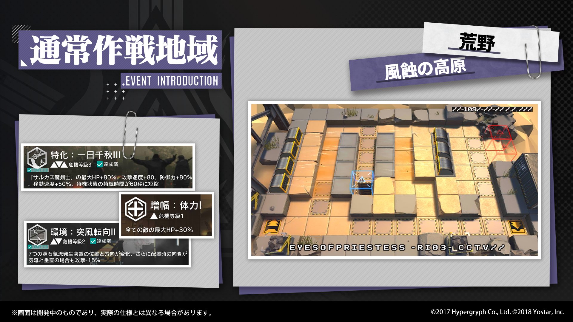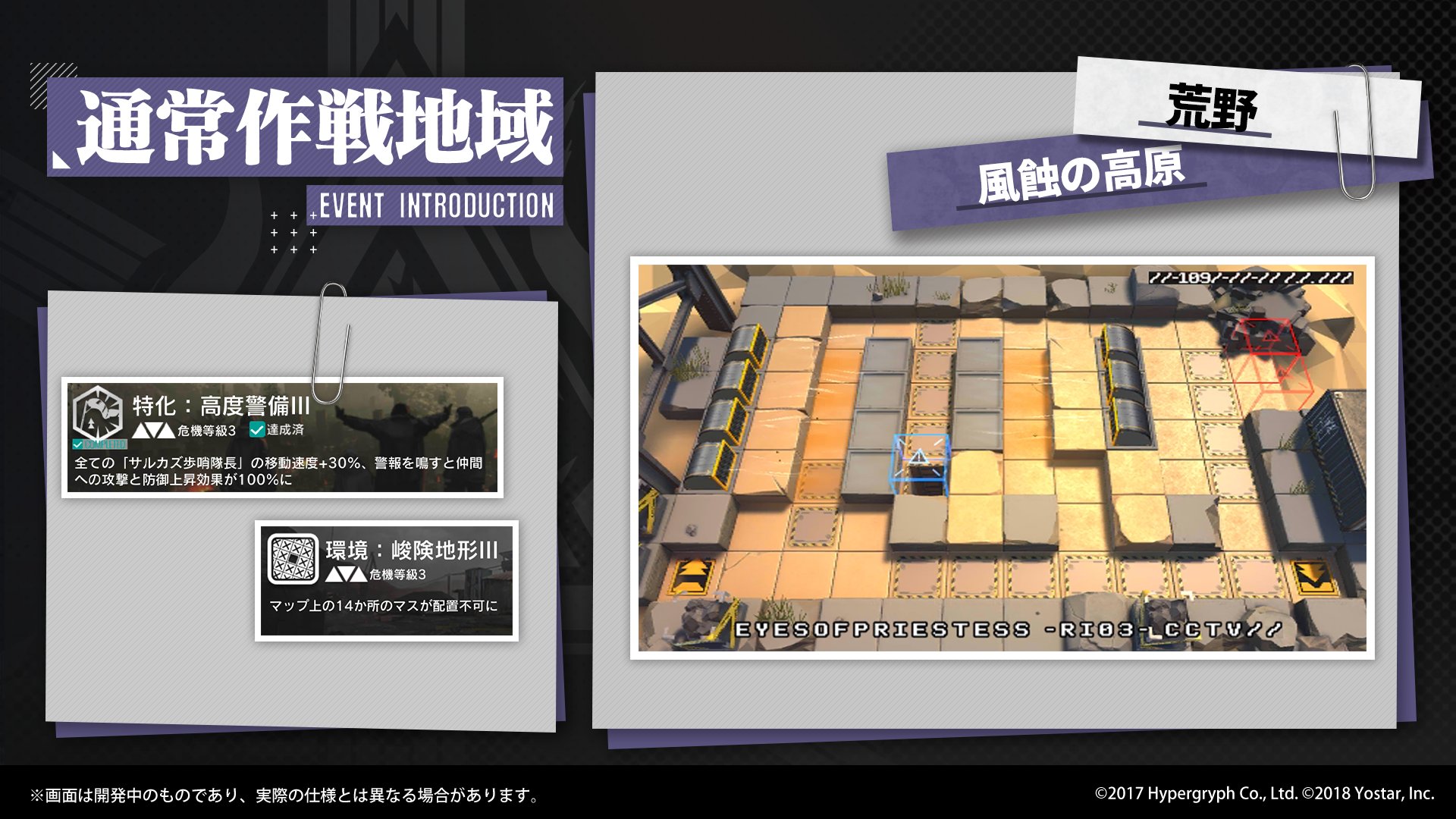 「通常作戦地域」では、今回新たに追加された、多数のマスが配置不可になる「契約」を含め、特定の敵を強化した状態で「風蝕の高原」を突破する任務があります。