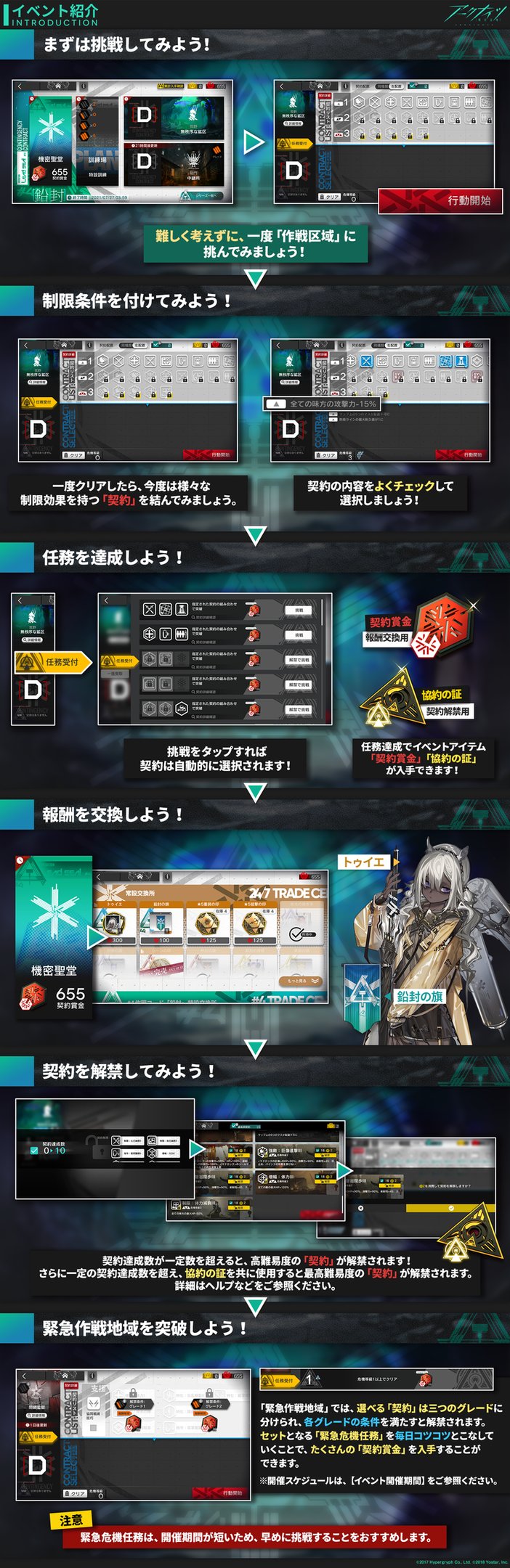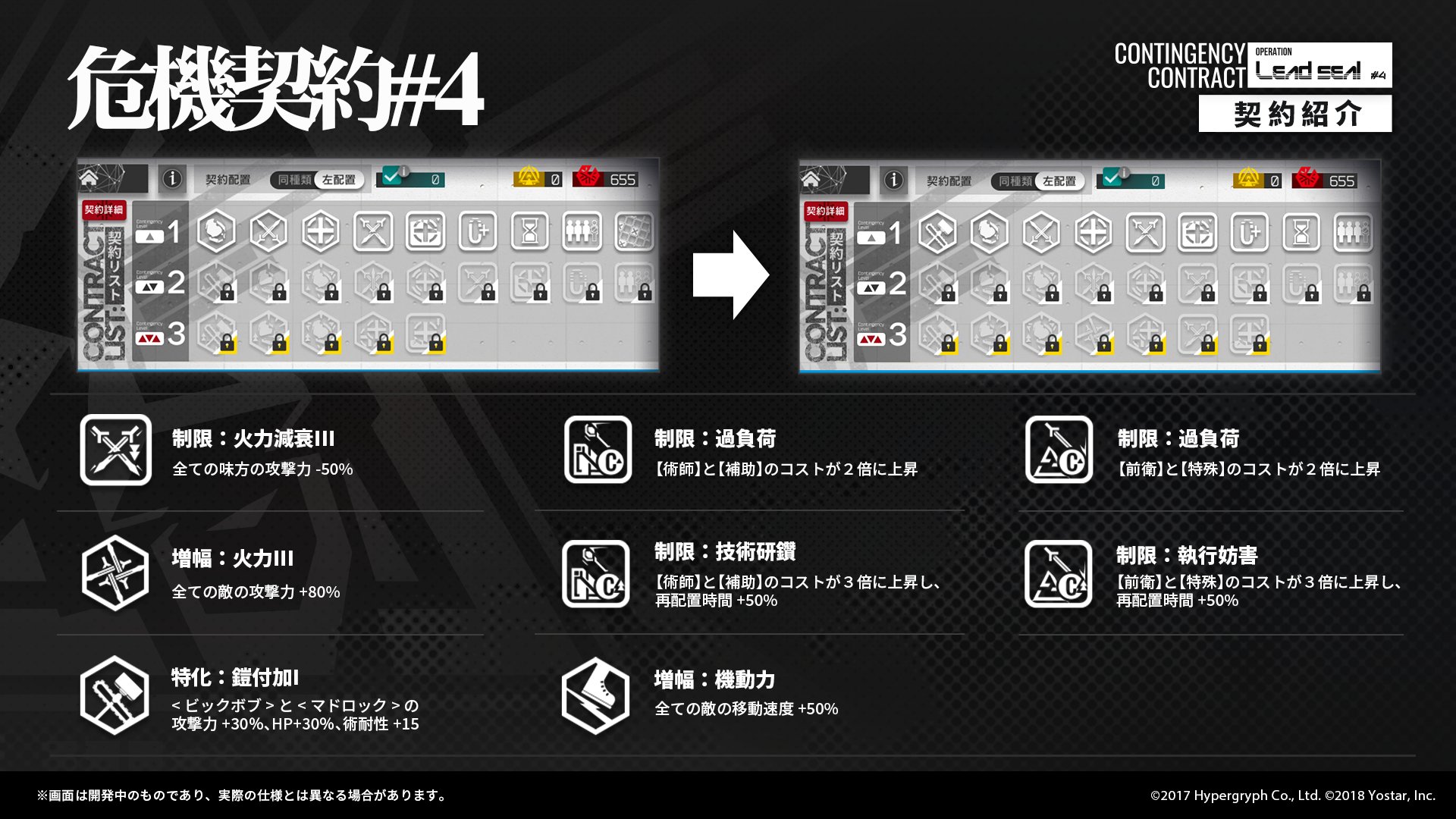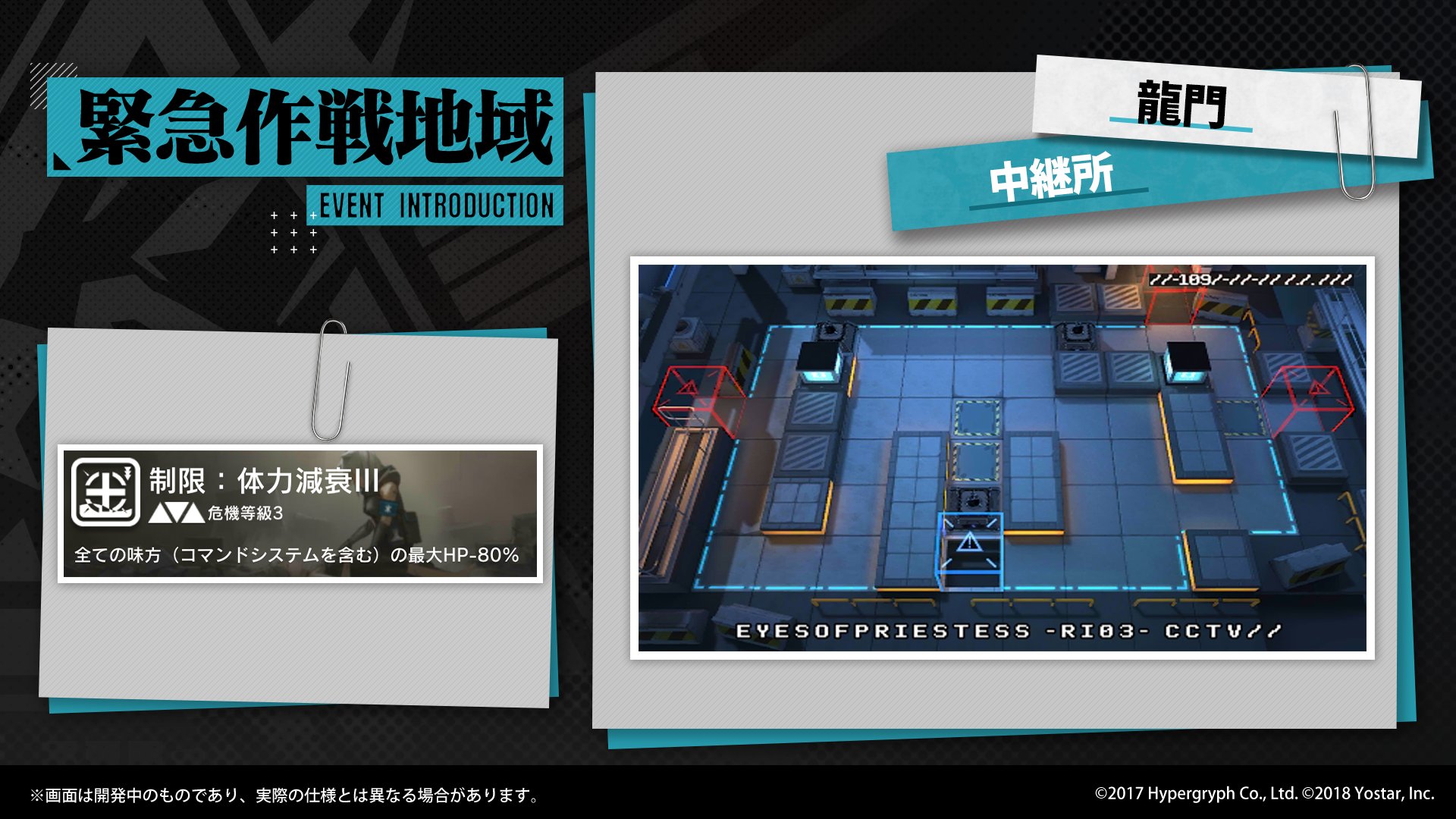現在の「緊急作戦地域」では、すべての味方及び「コマンドシステム」の最大HPを大幅に低下させる「契約」を結んで「中継所」を突破する任務があります。
