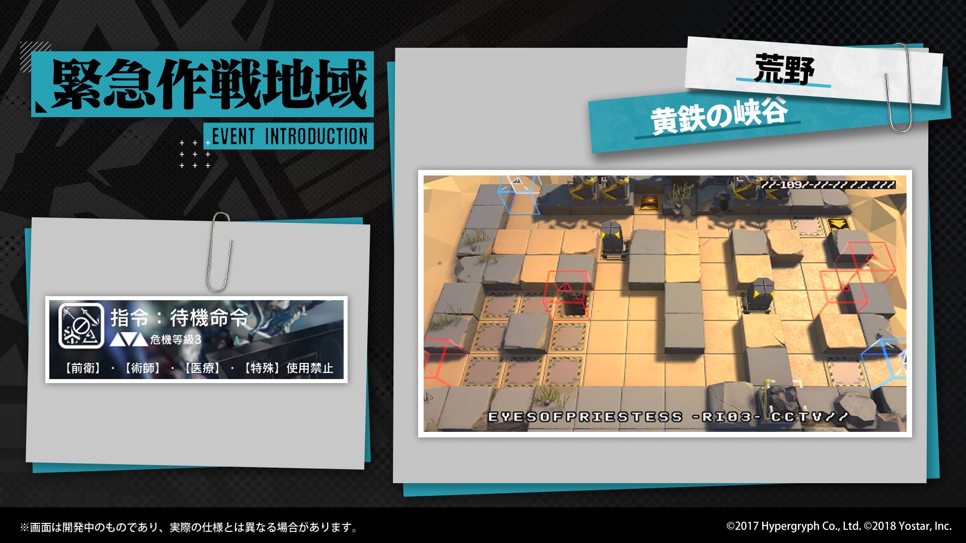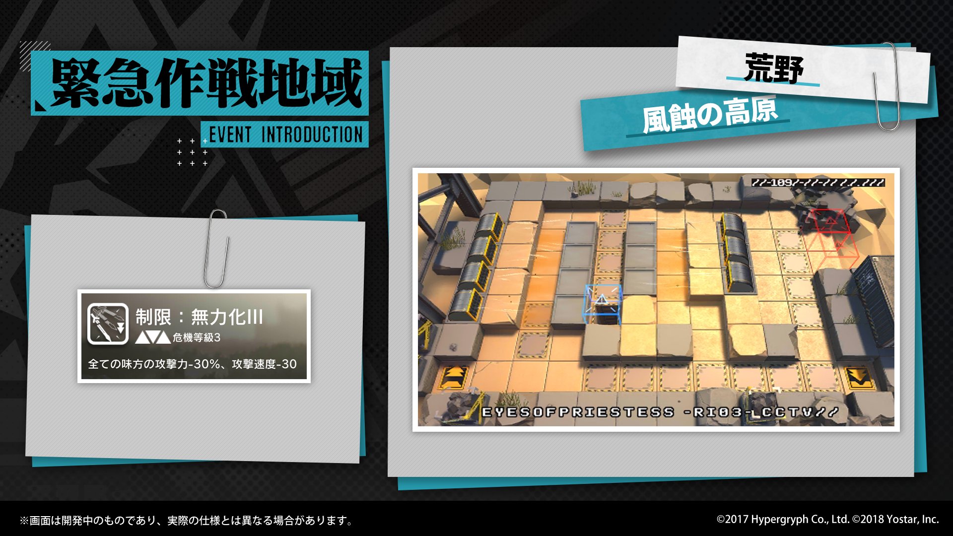 現在の「緊急作戦地域」では、全ての味方の攻撃力及び攻撃速度を低下させる「契約」を結んだ状態で「風蝕の高原」を突破する任務があります。