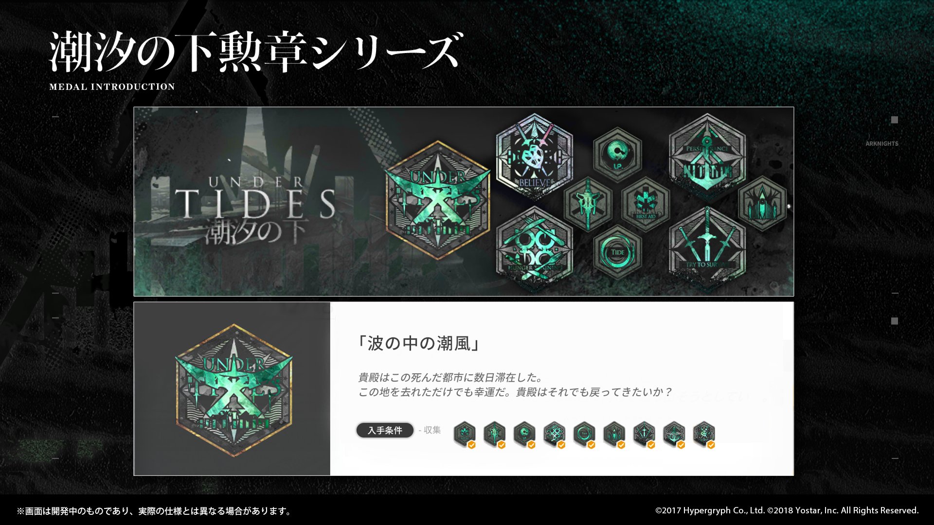 現在開催中のSIDE STORY「潮汐の下」では、イベント限定の功績勲章シリーズを揃えることができます。