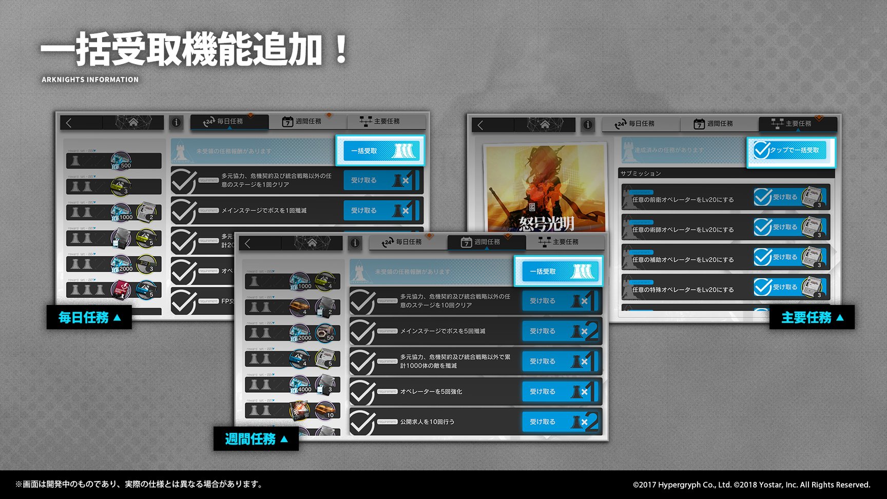 次回のメンテナンス後、毎日任務、週間任務、及び主要任務の一括受取機能が追加されます。