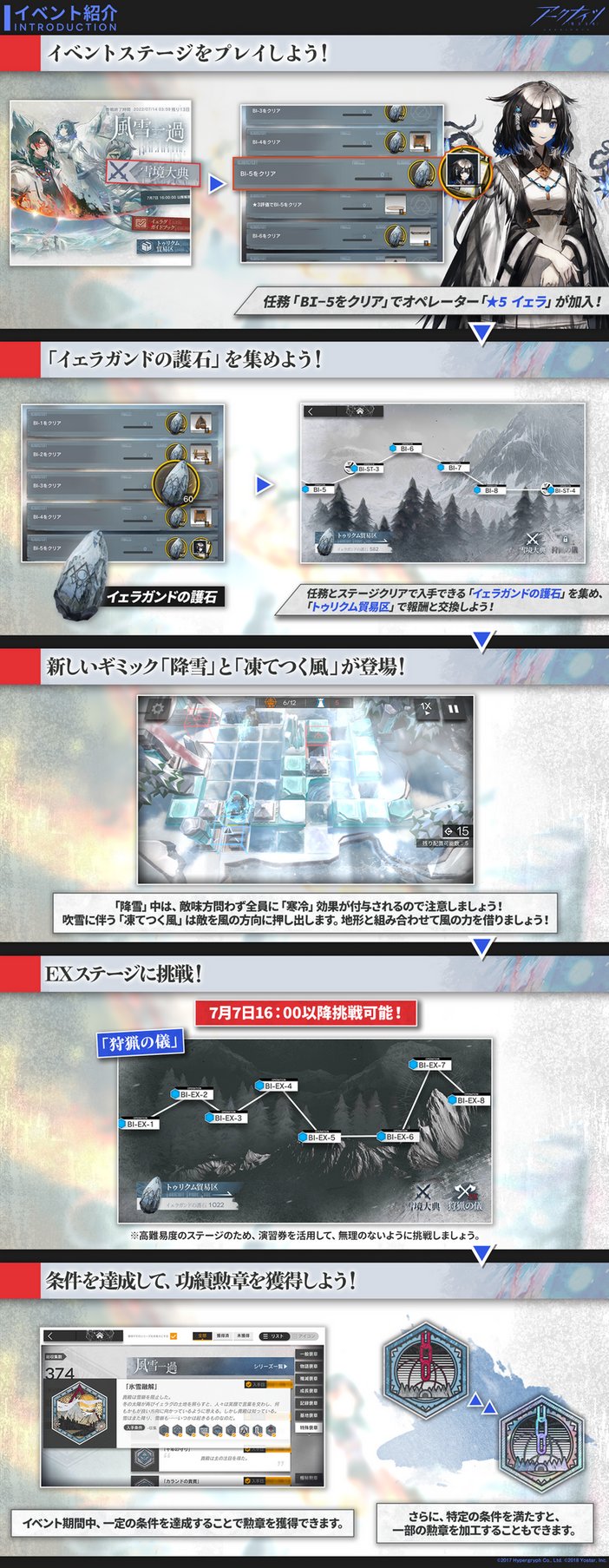イベント「風雪一過」では、雪境での戦闘になり、新ギミック「降雪」、「氷面」、「氷のカーブ」、「凍てつく風」も登場します。