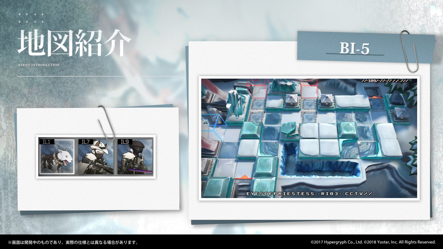 イベントステージ「BI-5」では、狭い雪境の戦場で敵と戦います。「氷面」と「氷のカーブ」を利用して敵を落とし穴に落とす手もあるようです。