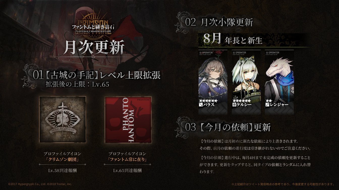 「古城の手記」のレベル上限拡張のほか、月次小隊や各種の依頼も更新されます。