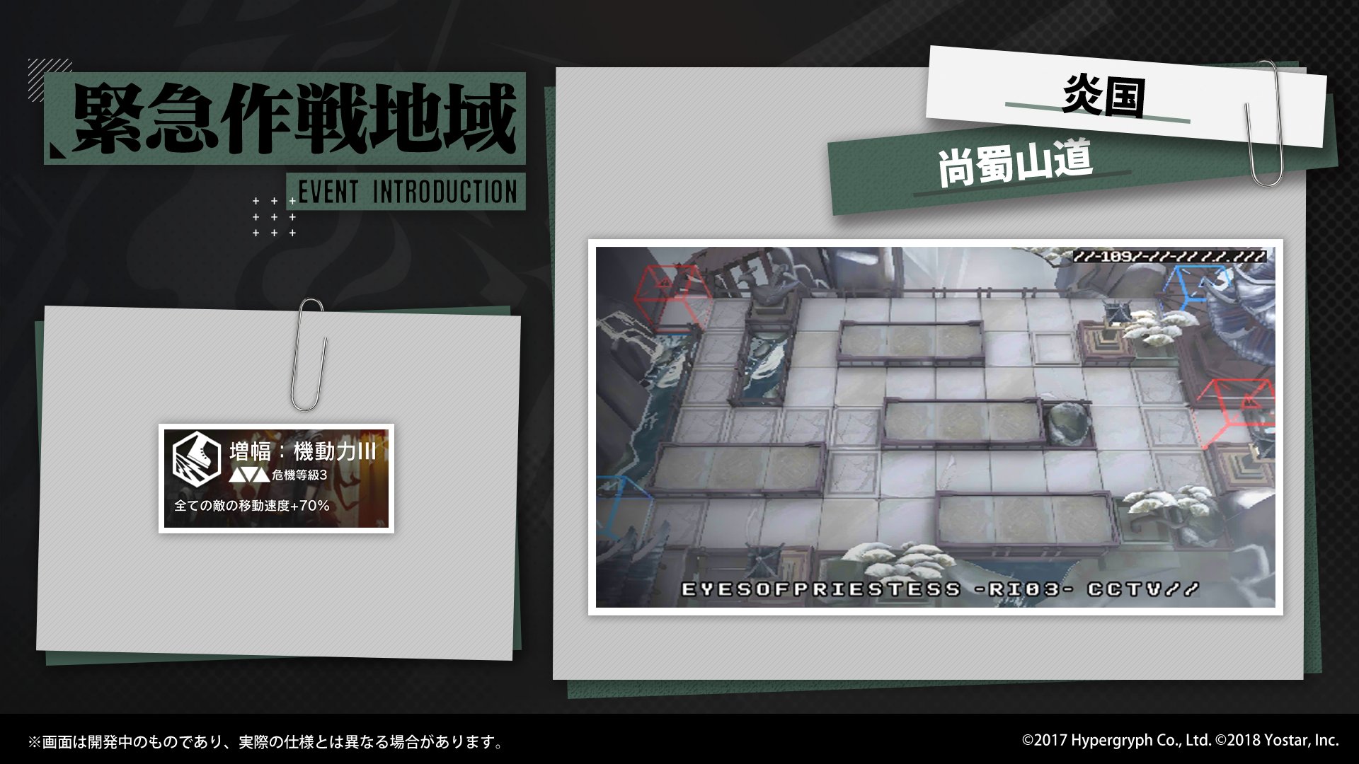 現在の「緊急作戦地域」では、すべての敵の移動速度を上昇させる「契約」を結んだ状態で「尚蜀山道」を突破する任務があります。
