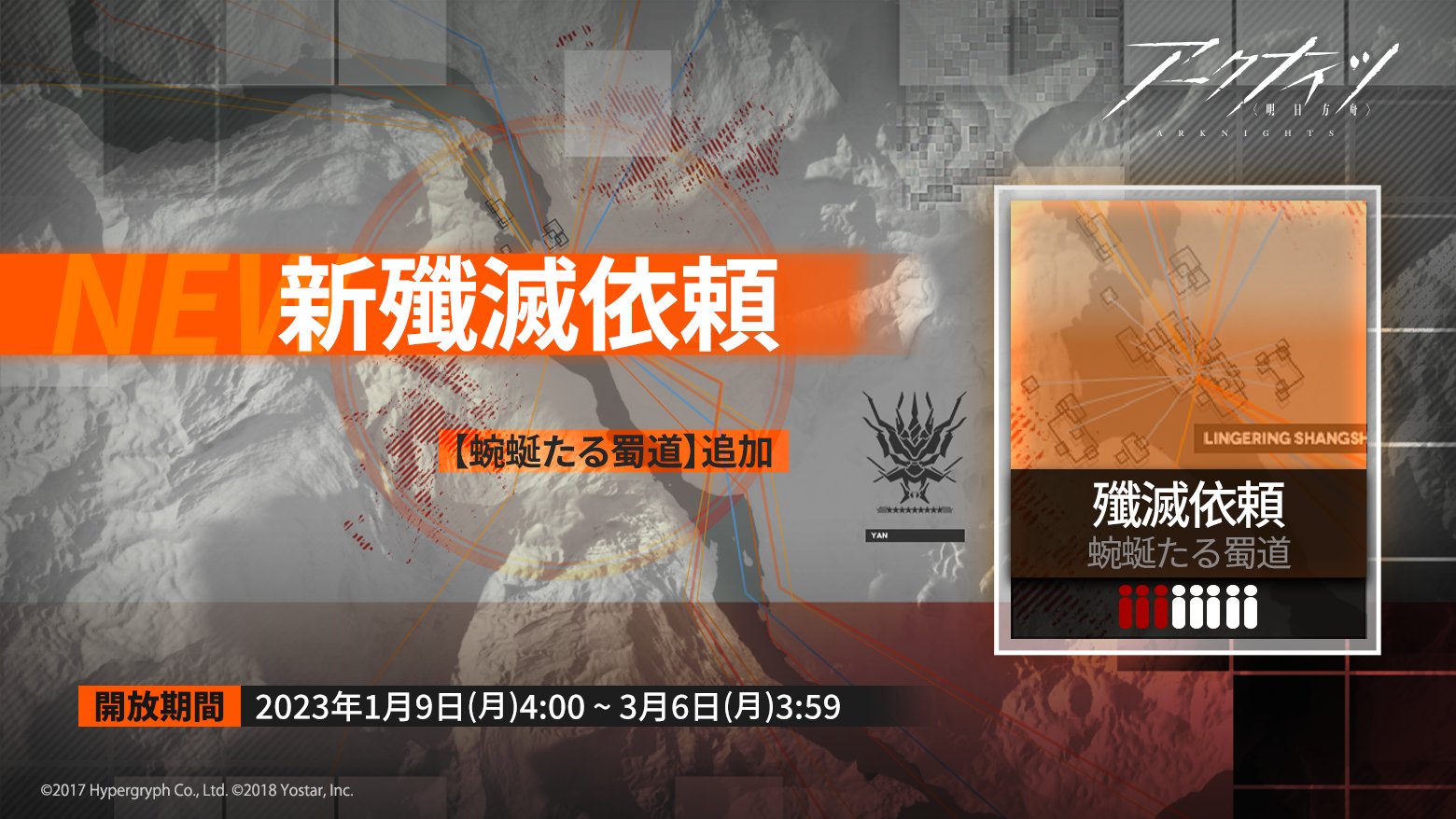 殲滅作戦が更新され、下記期間にて新殲滅依頼「蜿蜒たる蜀道」が開放されます。