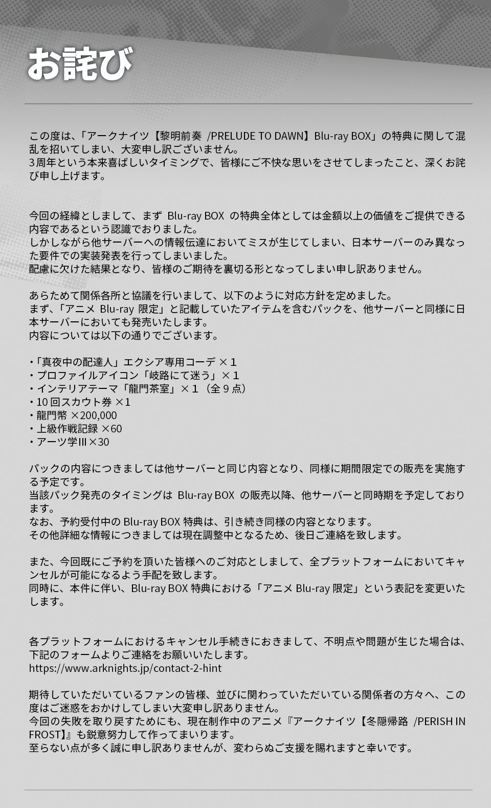 この度は、「アークナイツ【黎明前奏 / PRELUDE TO DAWN】Blu-ray BOX」の特典に関して混乱を招いてしまい、大変申し訳ございません。