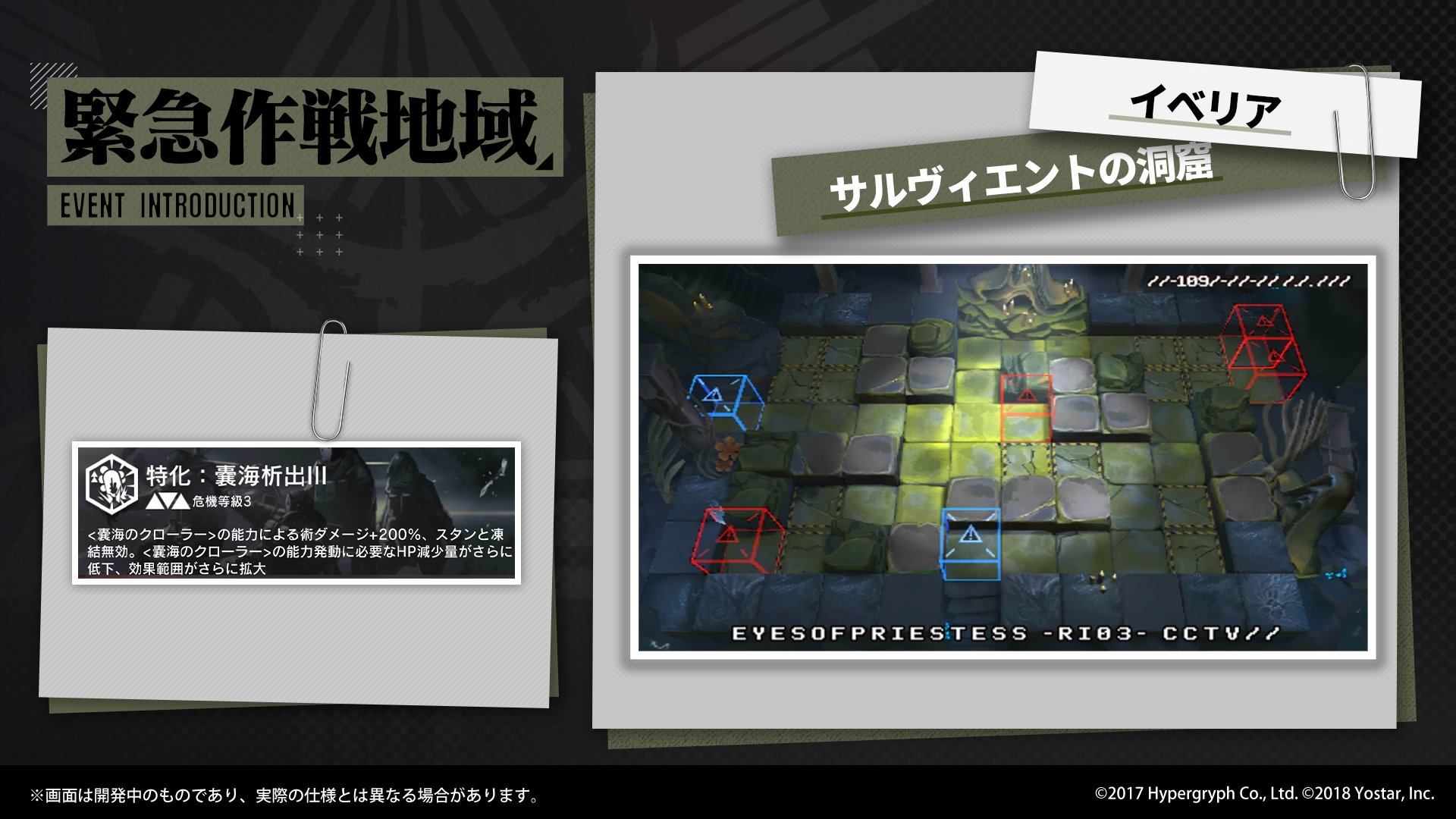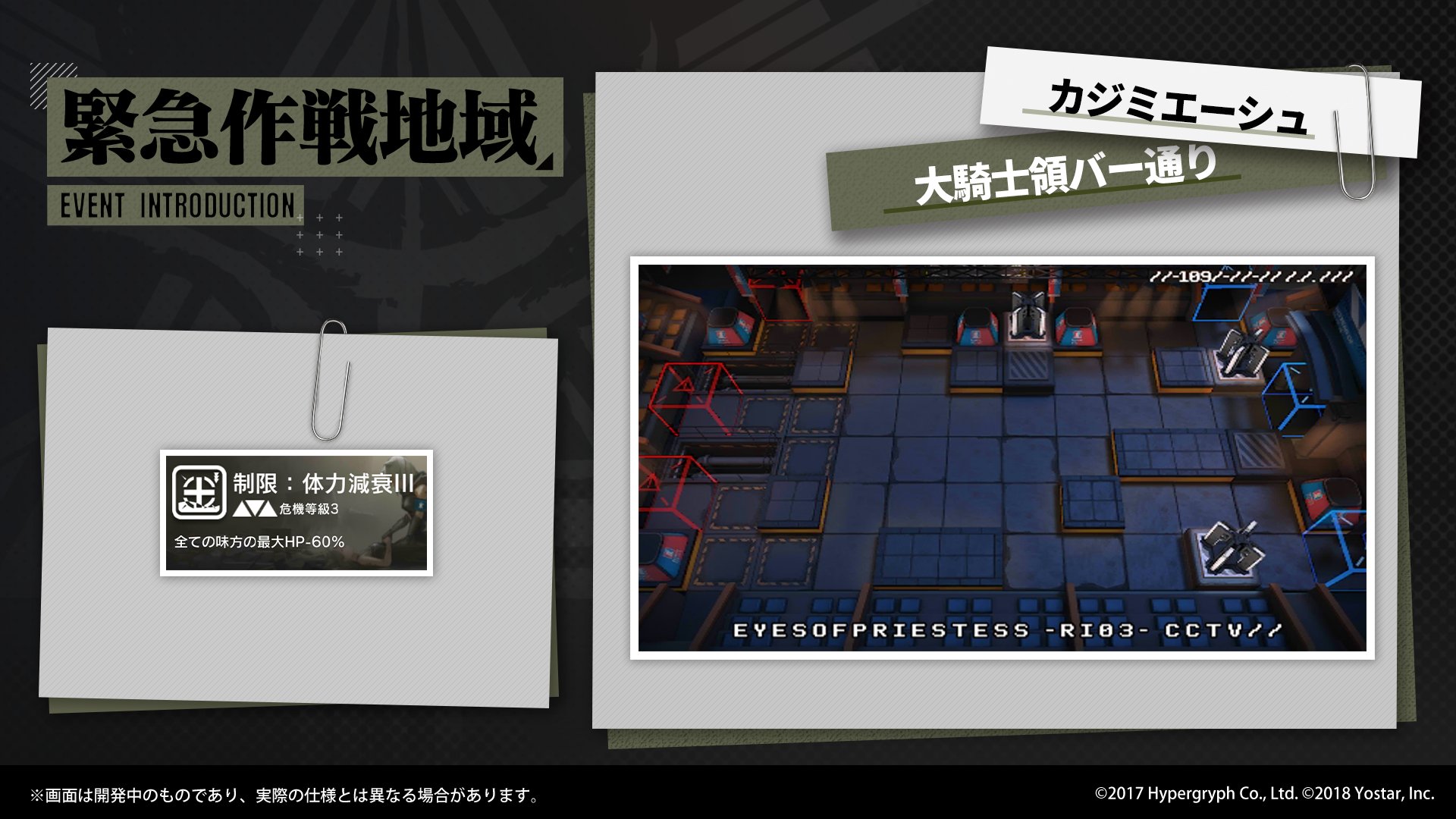現在の「緊急作戦地域」では、すべての味方の最大HPを低下させる「契約」を結んだ状態で「大騎士領バー通り」を突破する任務があります。