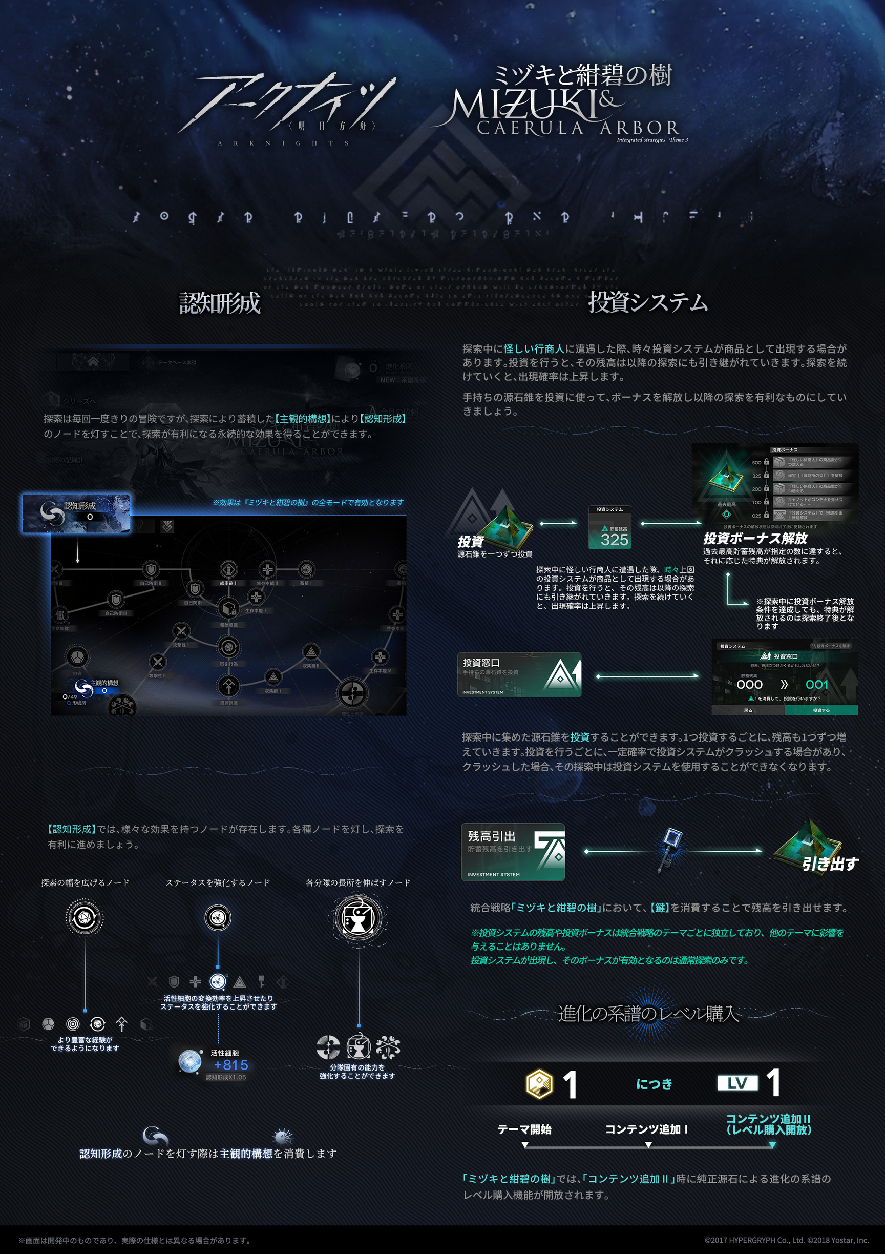 最後にテーマ「ミヅキと紺碧の樹」の「認知形成」、「投資システム」、「進化の系譜のレベル購入」についてご紹介します!