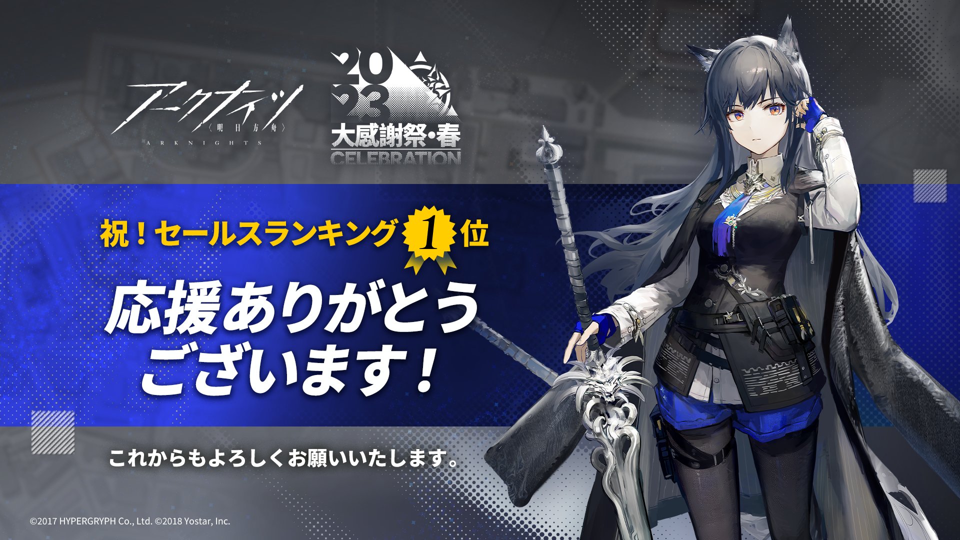 ドクターの皆さんのおかげで、アークナイツはセールスランキングで1位にランクイン!