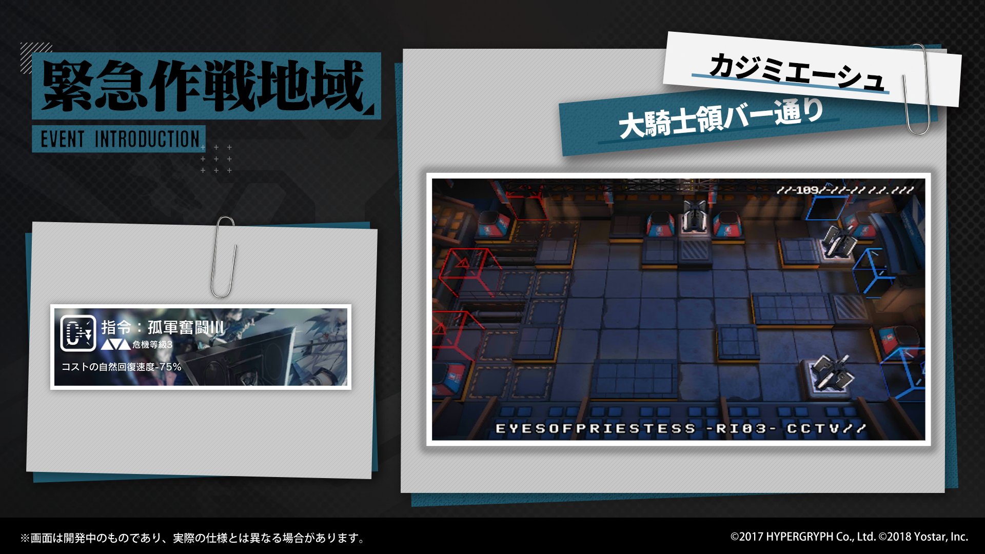 現在の「緊急作戦地域」では、コストの自然回復速度を低下させる「契約」を結んだ状態で「大騎士領バー通り」を突破する任務があります。