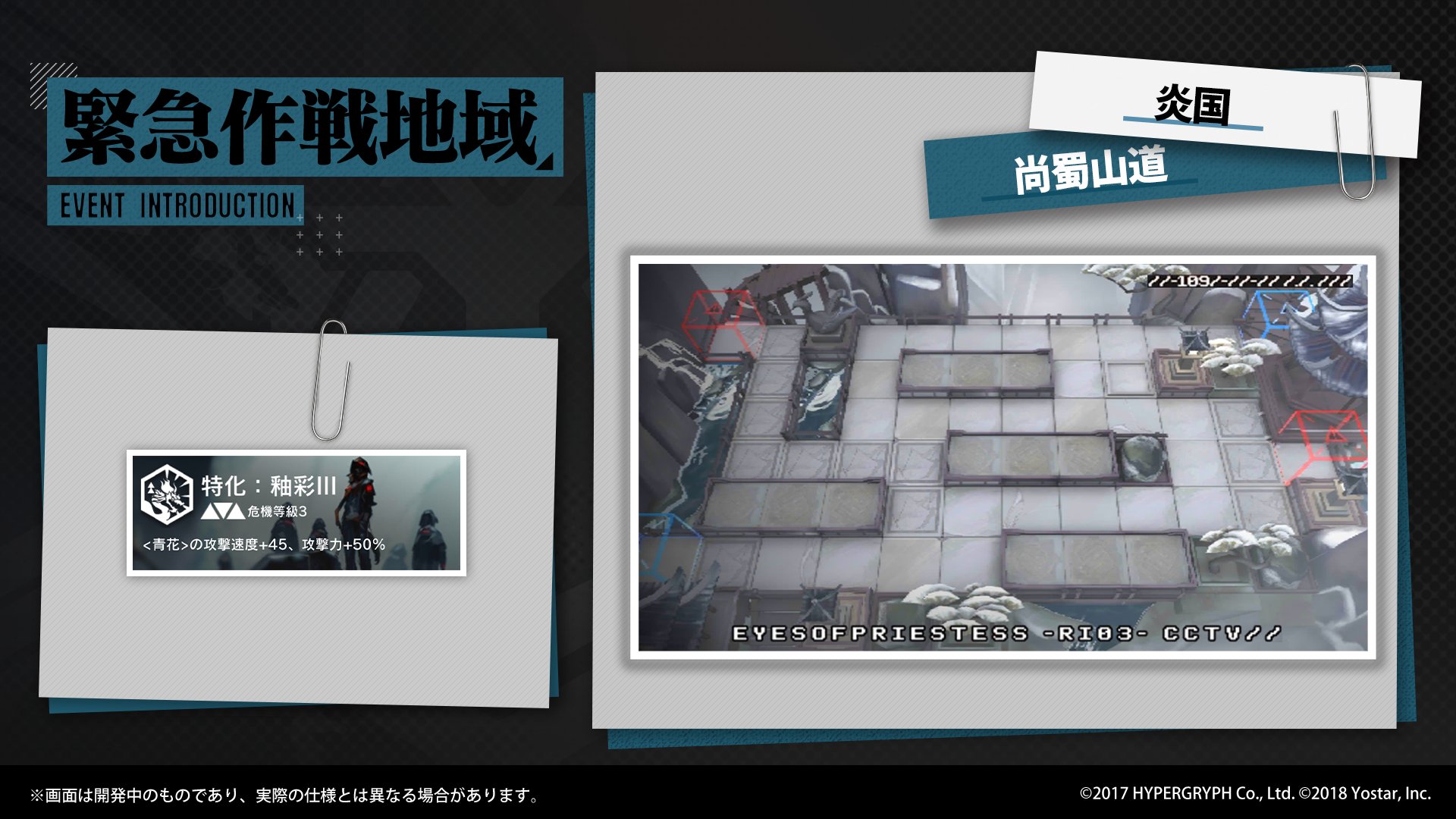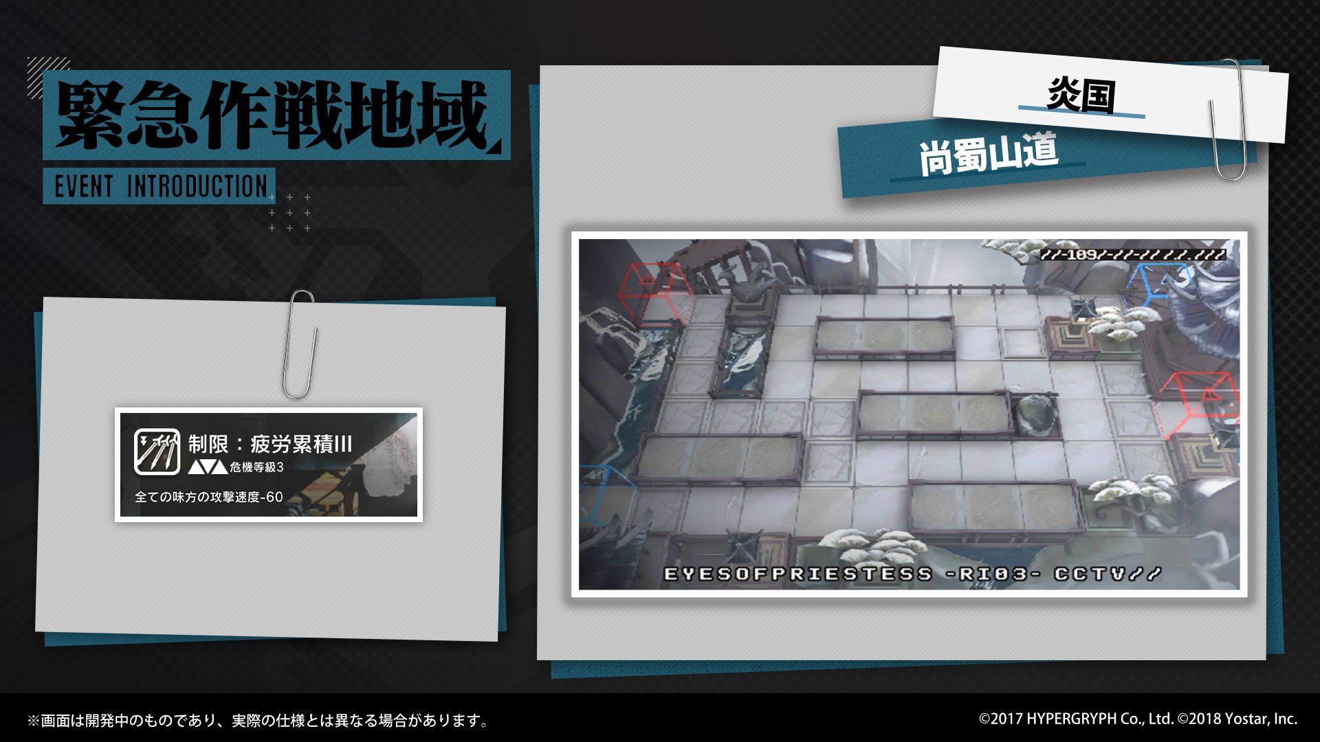 現在の「緊急作戦地域」では、味方の攻撃速度を大幅に低下させる「契約」を結んだ状態で「尚蜀山道」を突破する任務があります。