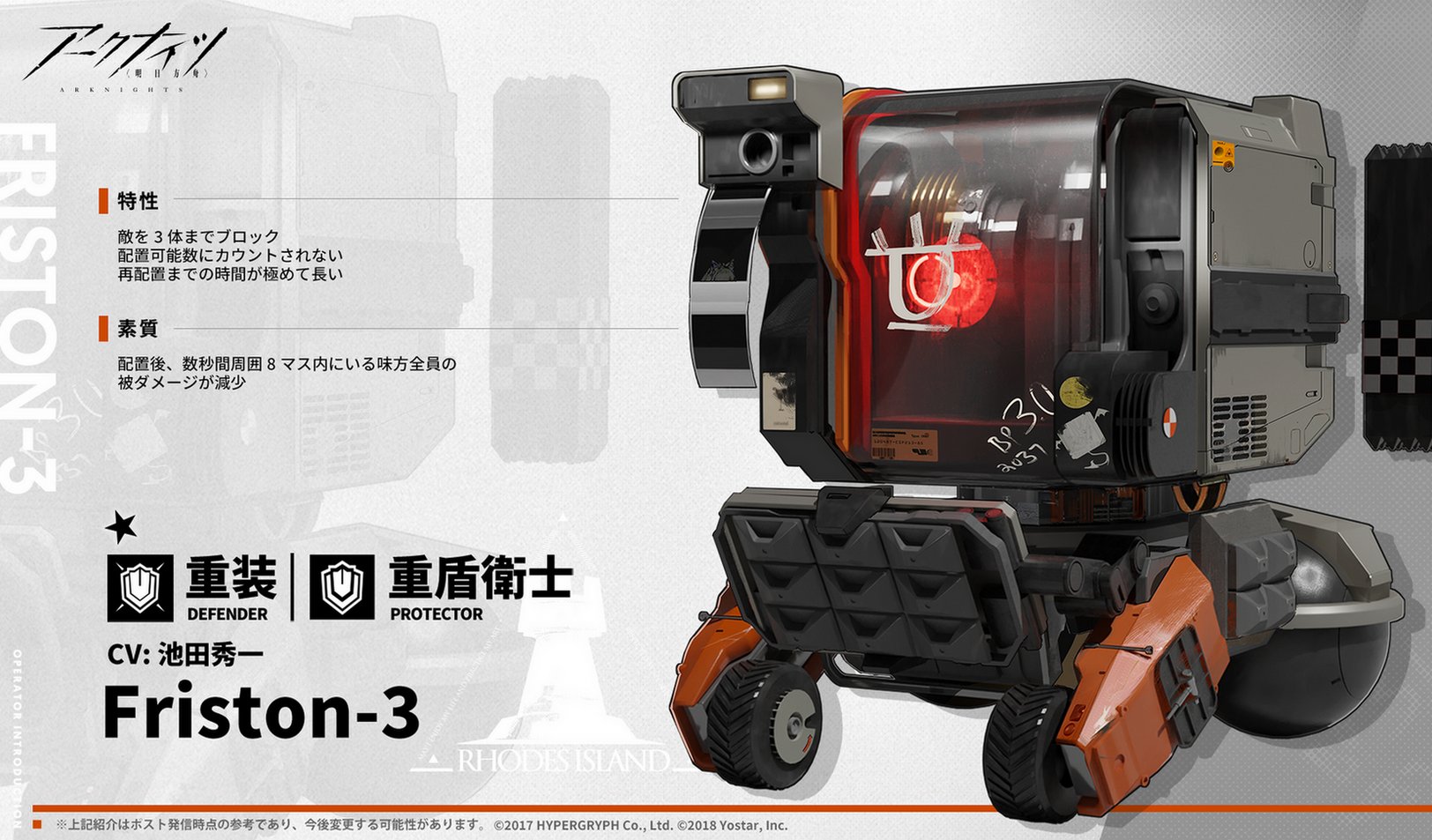 味方全員の被ダメージを減少できる重装オペレーター「Friston-3」(CV: #池田秀一)は、本日12/5(火)より開催予定のイベント「尖滅試験作戦」にて無料入手可能!