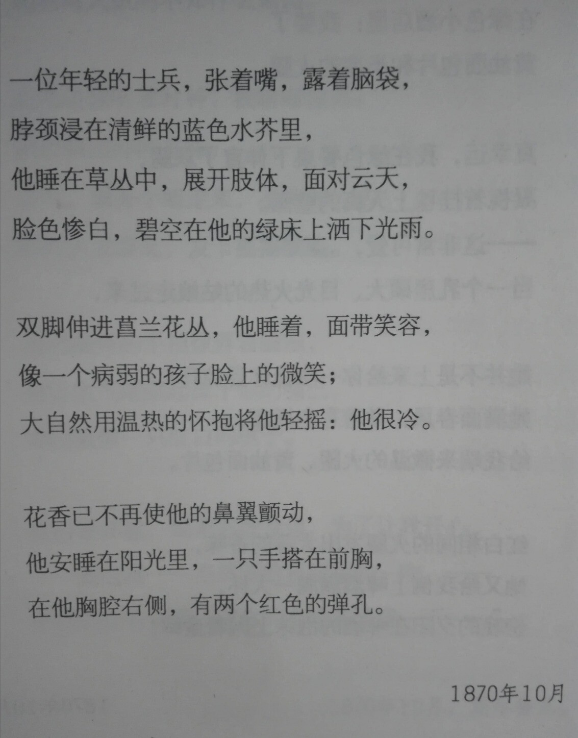 對於蘭波的這首詩印象很深刻💦想起來很久之前自己胡亂造的詞“殘酷的詩意”,竟覺得很適合最後的那句“在他的胸腔右側,有兩個紅色的彈孔”真的好打動我💦悲傷又悽美第一次聽說蘭波这个名字,是在阅读朱川凑人的《书签之恋》时ww