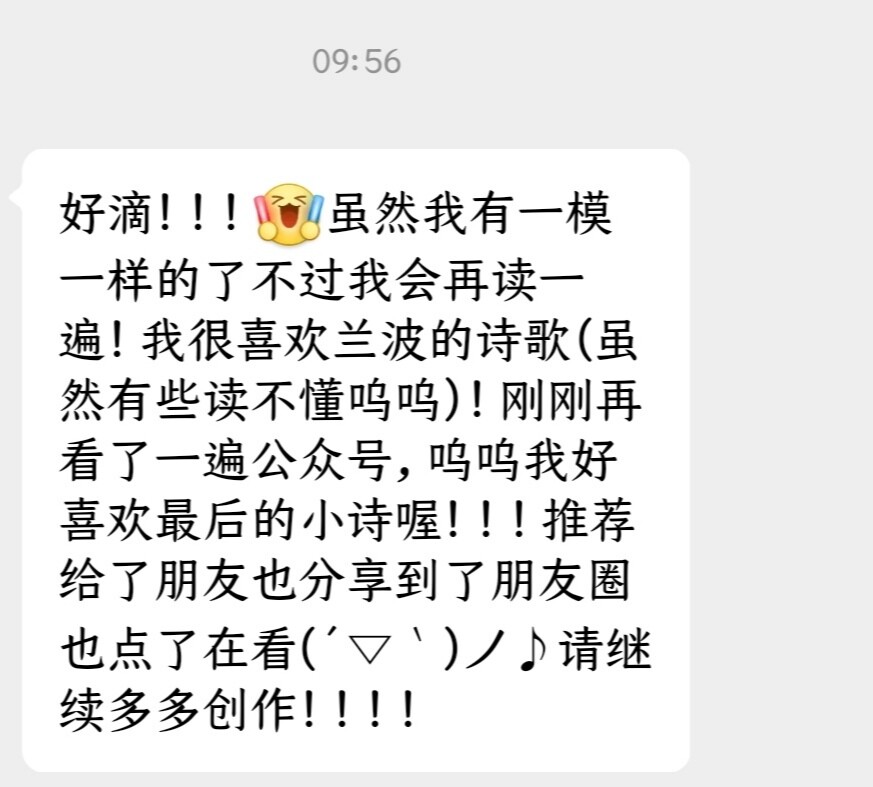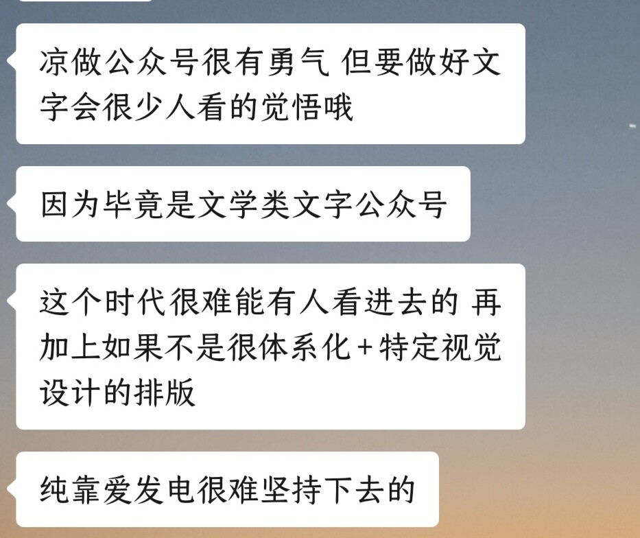 (><) 想起來朋友說“但要做好文字會很少人看的覺悟哦”因為活在同溫層中太久,朋友們大多有著相近的興趣,觀念。僅僅是短暫離開同溫層,就突然發現不是大部分人都會願意閱讀詩歌,看文學類文字內容(><)但就算是“用愛發電”也想堅持下去💦💦