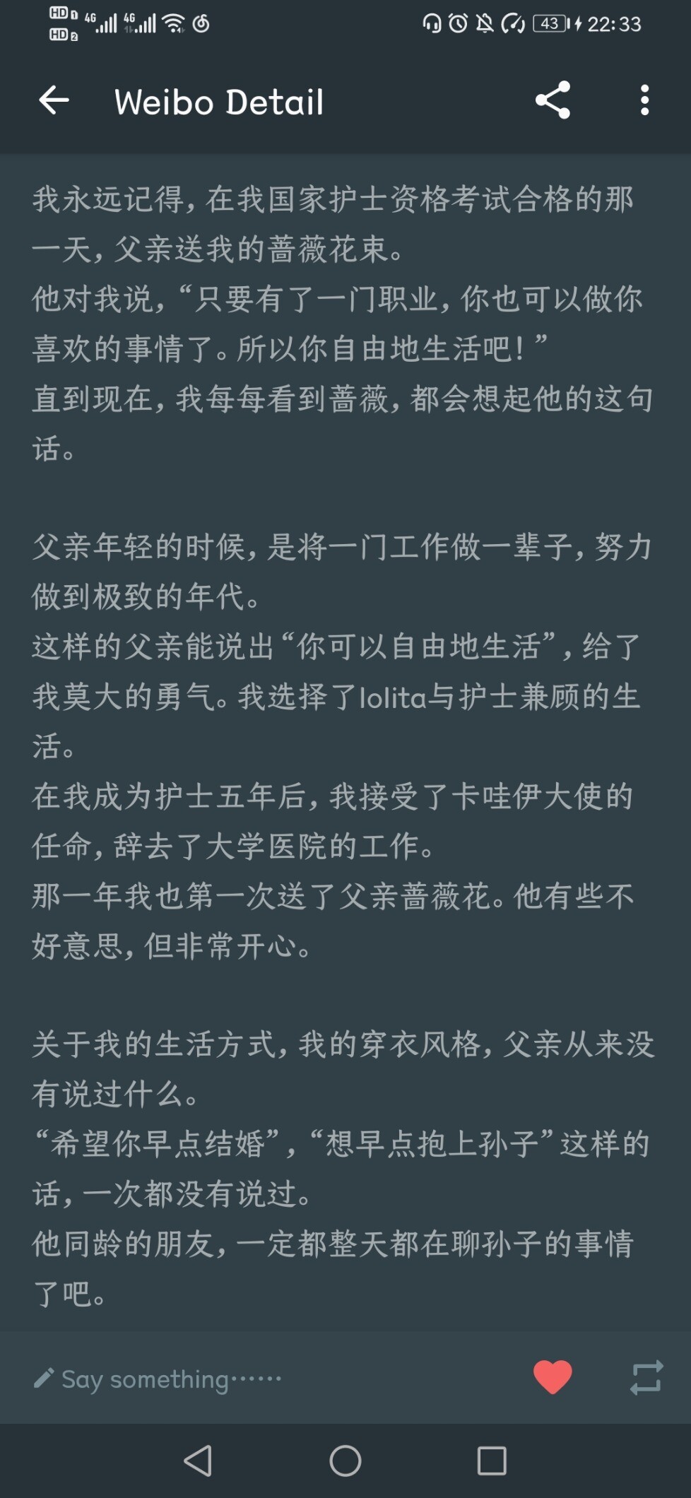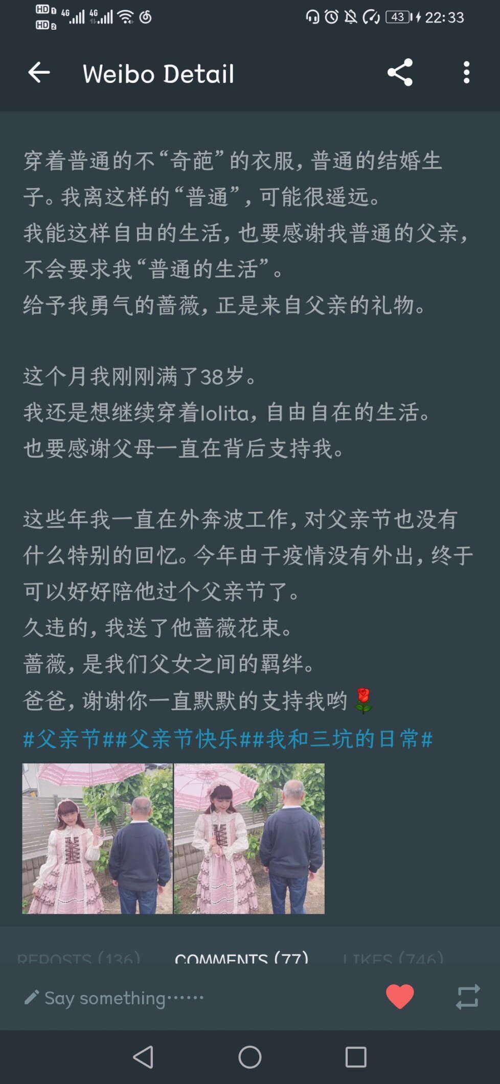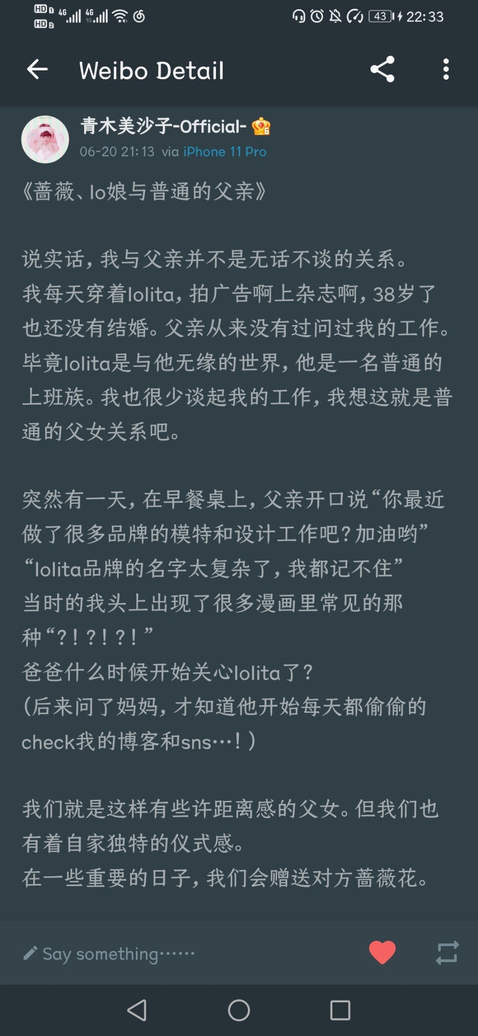 偶然間看見青木美沙子會長的這條wb,覺得有些感動😢 知道她已經38歲了還小小地驚訝了一下💧才知道她的父親因為她也關注起Lolita,充分尊重她的決定,默默地支持著她🥺羨慕這樣的情感聯結,也覺得很感動💧