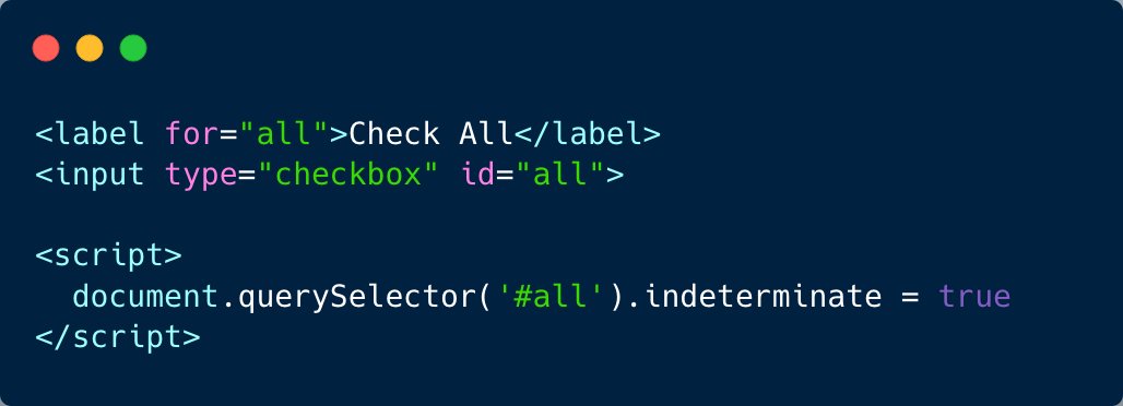 TIL that there is an indeterminate state for native checkboxes in HTML. 😮 You can only set it via JS.
