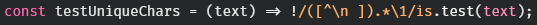 JS one-liner to test whether a string contains duplicate characters using the JS Set object.