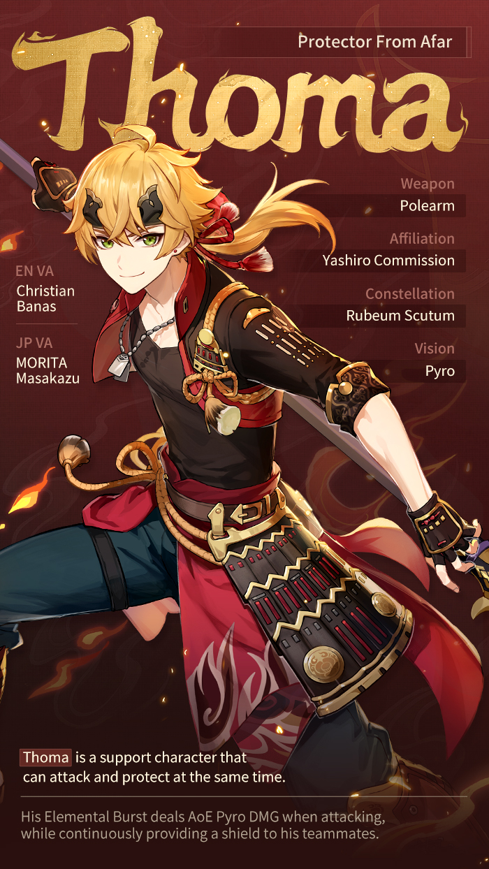 Travelers \ (^ o ^) / ~Today, we will be introducing a new character, Thoma!See Full Details >>>#GenshinImpact #Thomahttps://genshin.mihoyo.com/en/news/detail/16729