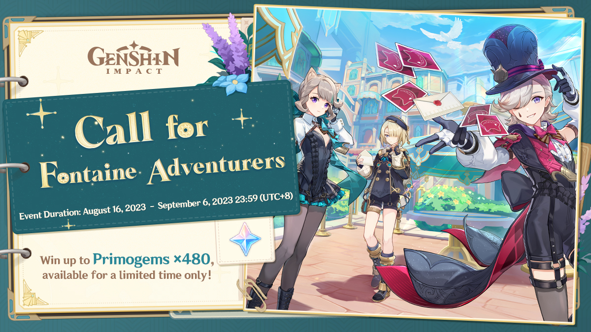 The "Call for Fontaine Adventurers" web event is now online! Take part for a chance to earn up to Primogems ×480!
