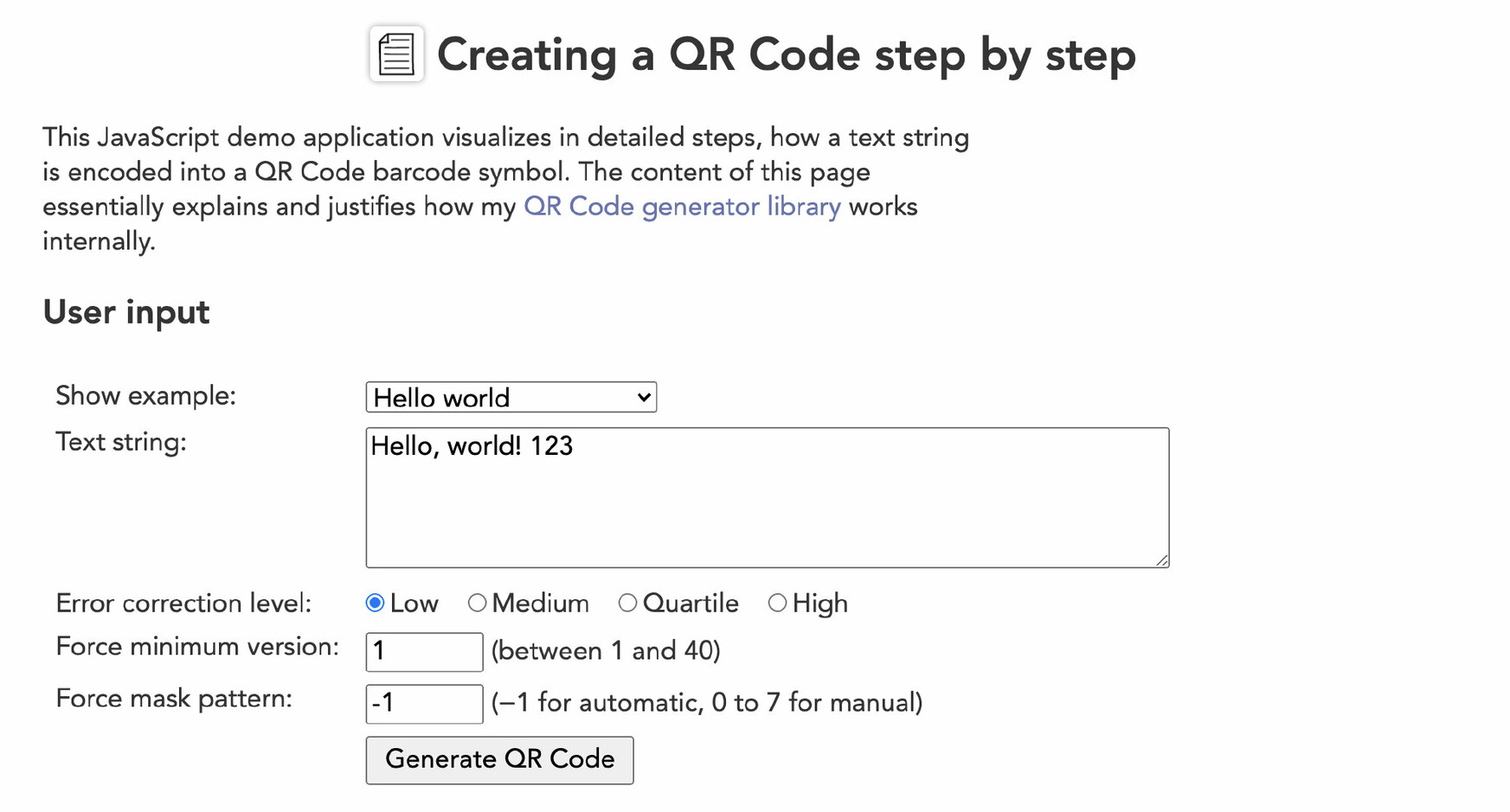 分享个可交互式的 JavaScript Demo 教学应用:「Creating a QR Code step by step」。