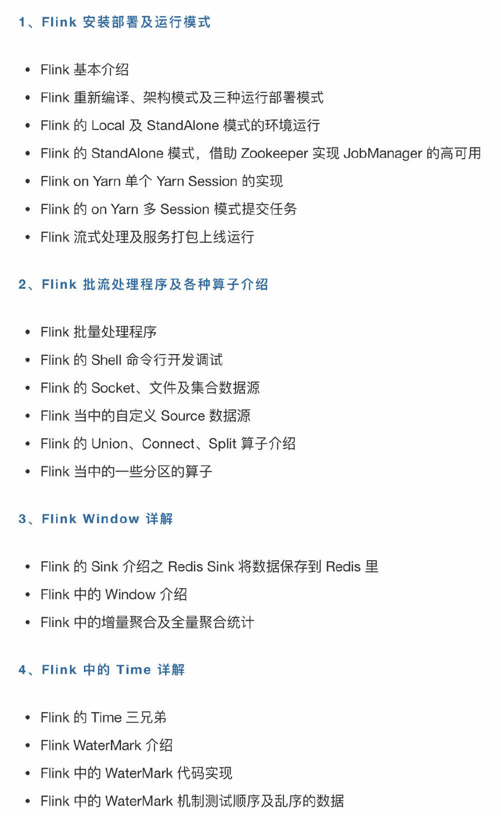 主要涵盖 Flink 安装部署、批量处理、算子介绍、Window、Time 技术点详解等内容。