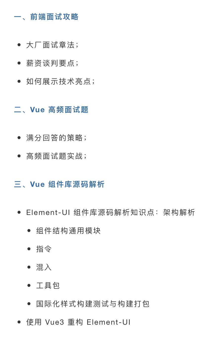 内容主要包含面试流程讲解、技术亮点展示、Vue 高频面试题解析、Vue 组件库源码解析等内容。