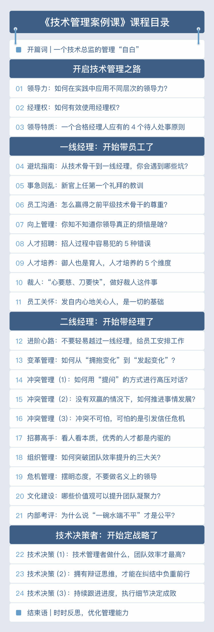 该课程将带你从技术管理的实际案例出发,了解常见误区,分析具体原因,寻求解决方案,从实际案例中摸清技术团队管理的套路。