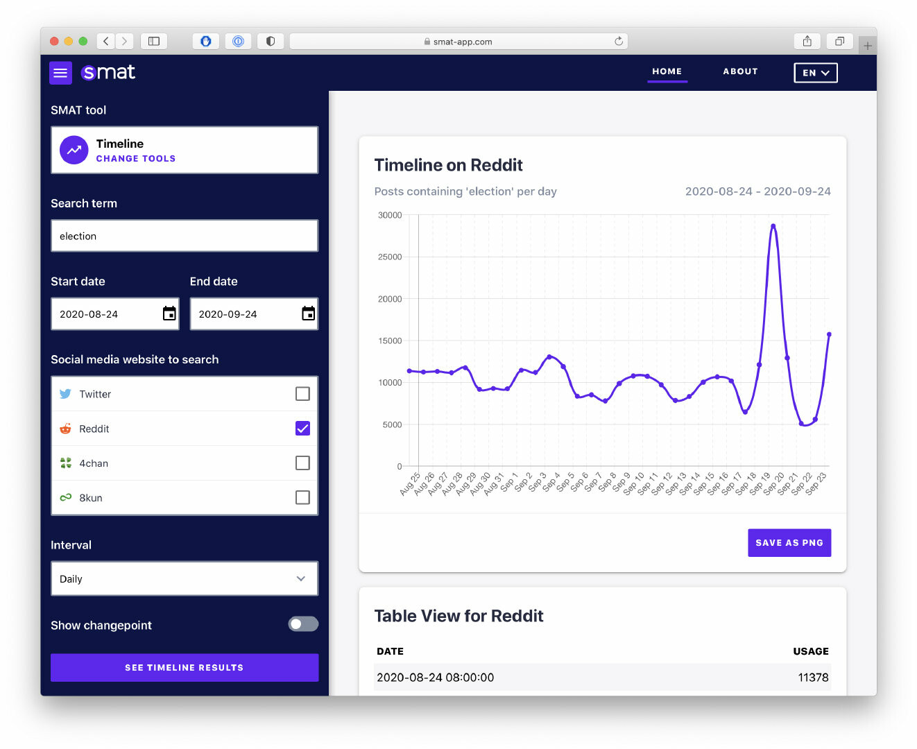 该工具通过可视化数据页面,向分析员直观展示了网友们在 Twitter、Reddit、4chan 和 8chan 上的热议内容,以便更好的研究某个热点新闻及社会舆论的走势,并支持将结果导出成 CSV 和 PNG 格式。