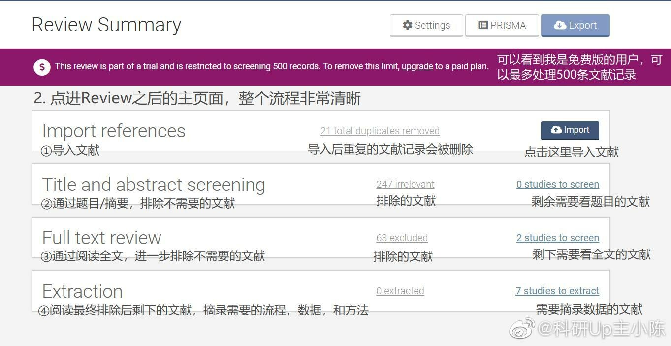 它的页面和逻辑非常简单,就是导入文献→通过题目和摘要排除文献→通过全文阅读排除文献→剩下的文献可以纳入综述范围。