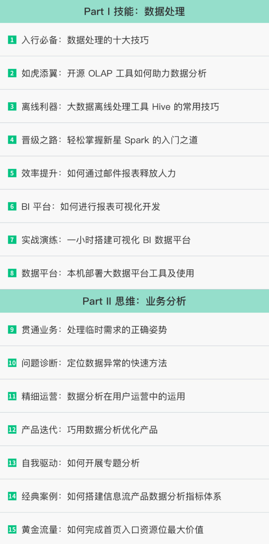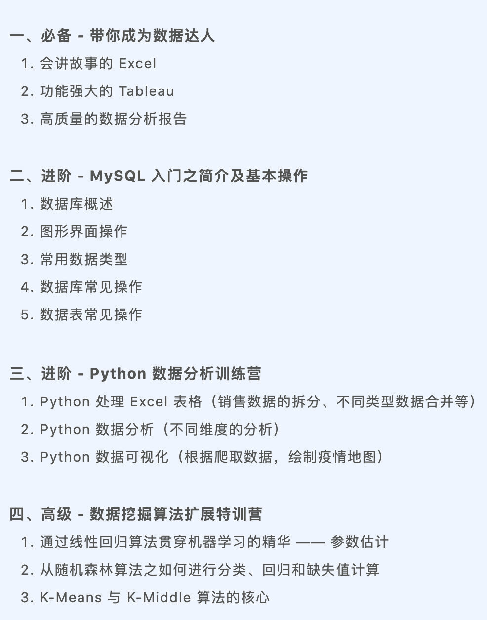 内容主要涉及 Excel、MySQL、Python 及数据挖掘算法等核心技能,帮助大家迅速提升数据分析能力,并能产出驱动业务增长的数据分析报告。