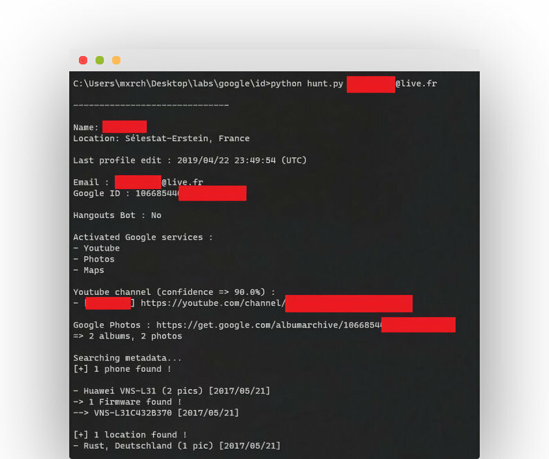 可通过 Google 邮箱地址,快速提取用户名、已激活的 Google 服务、公开照片、手机型号与固件、已安装软件、潜在的用户名与地理位置等信息。