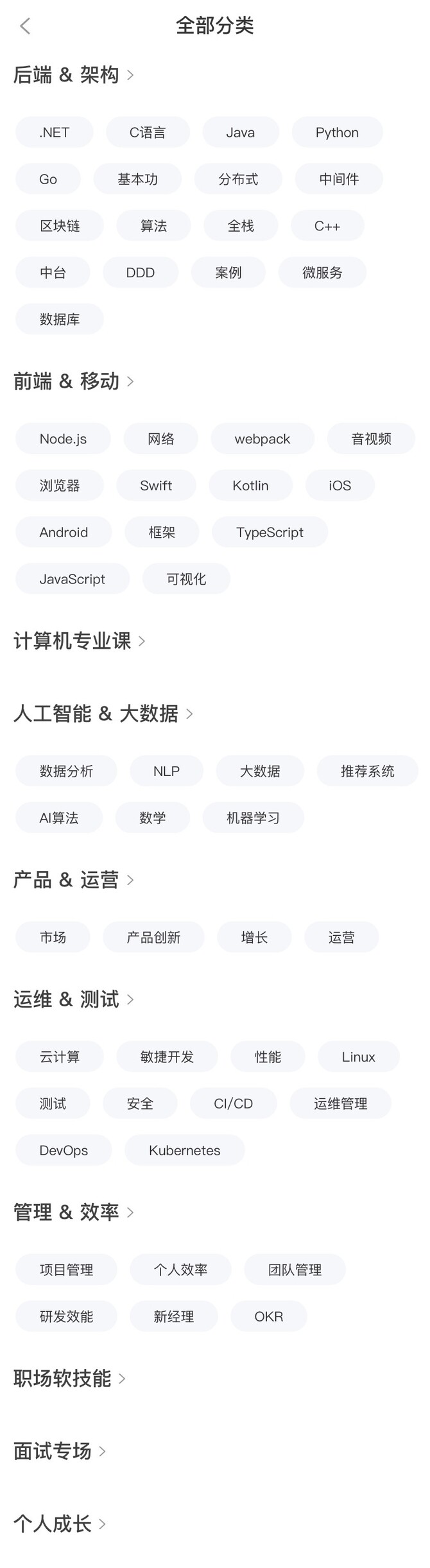 - 出自 BAT、Google、Facebook 等国内外一线企业技术专家的专栏课,从开发到效率,从实战到管理。领域涉及前端、后端、架构、移动、运维、人工智能、测试等等。