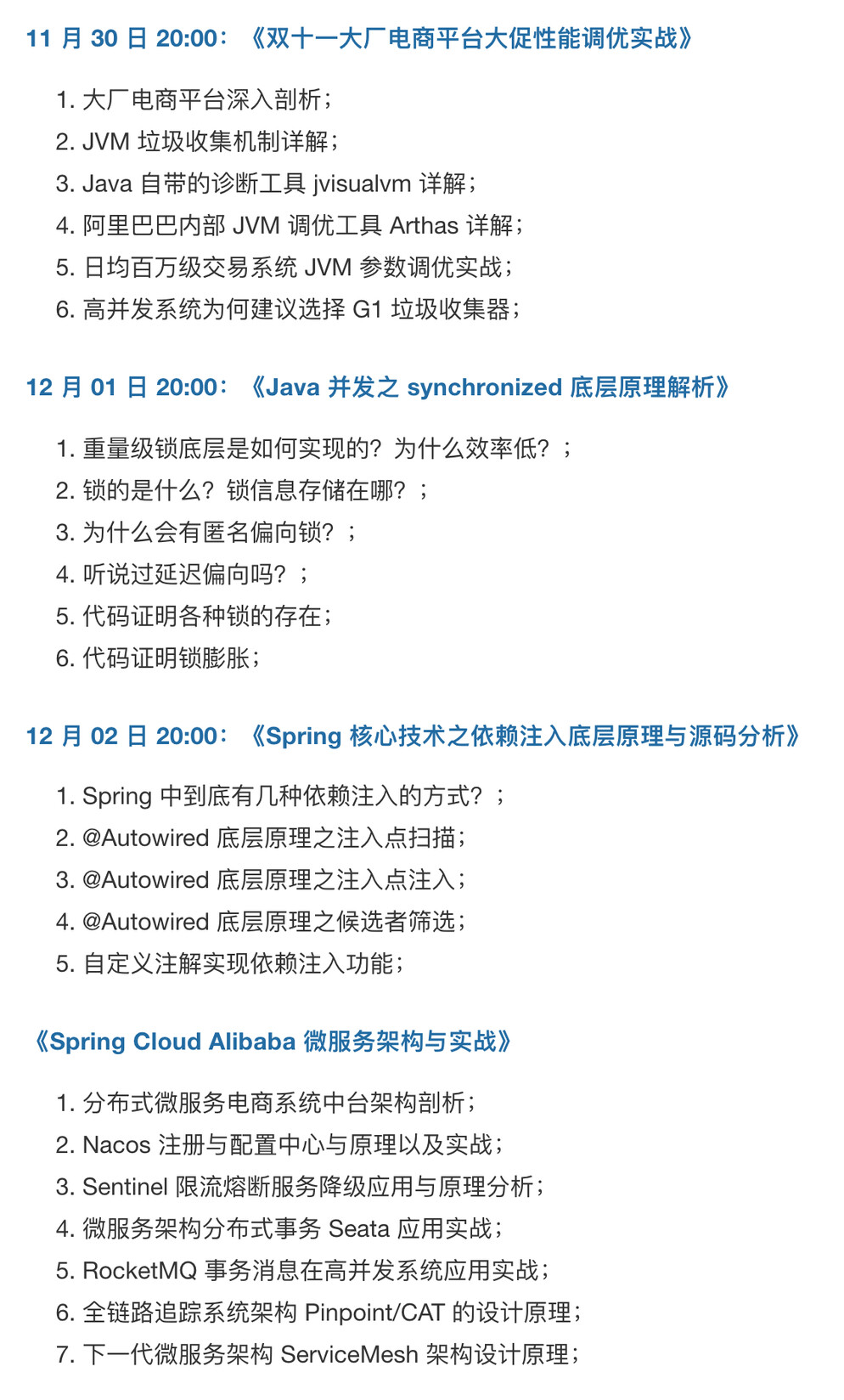 分享个 Java 技术公开课,主要讲解 Java 性能调优、synchronized 底层原理解析、Spring 依赖注入及源码分析、微服务架构与实战等内容。