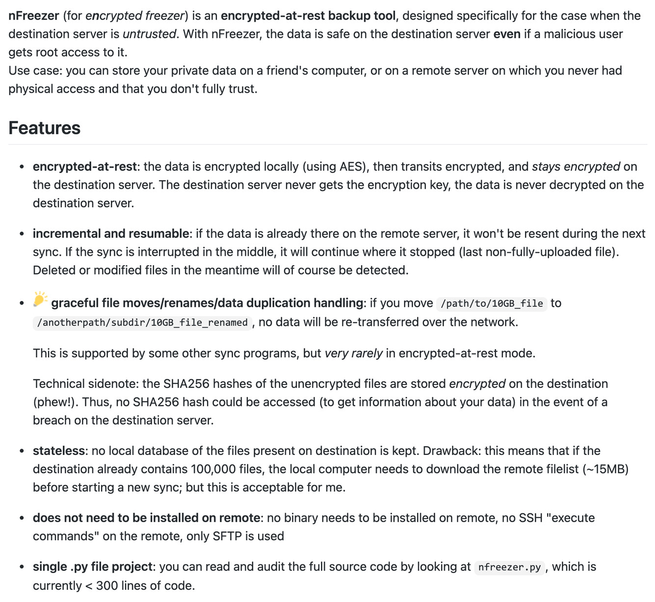 GitHub 上一个开源的静态备份加密工具:nFreezer,其主要作用是,当恶意用户获得 root 访问权限时,数据也可以在目标服务器上安全保存。
