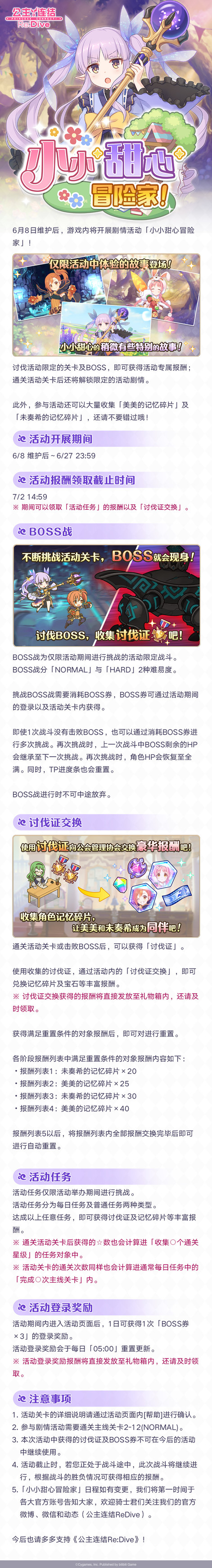6月8日维护后,游戏内即将开展剧情活动「小小甜心冒险家」,并同步开启「活动关卡」玩家经验1.5倍庆典!