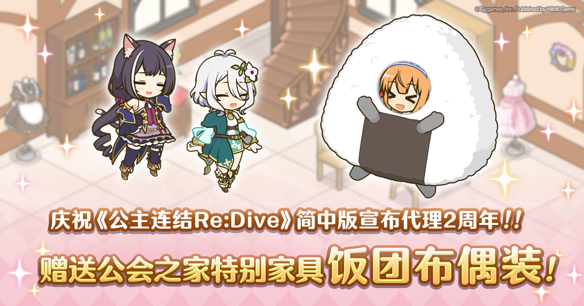 今天是《公主连结Re:Dive》简中版宣布代理的2周年纪念日,为庆祝这一纪念日,我们为大家准备了公会之家的特别家具「饭团布偶装」!快去礼物盒领取可爱的饭团布偶装吧~