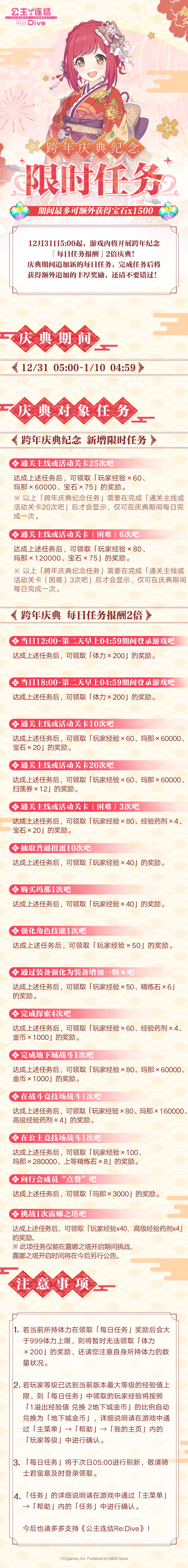 12月31日05:00起,游戏内将限时追加「跨年庆典纪念任务」,并同步开启「每日任务报酬2倍」庆典!