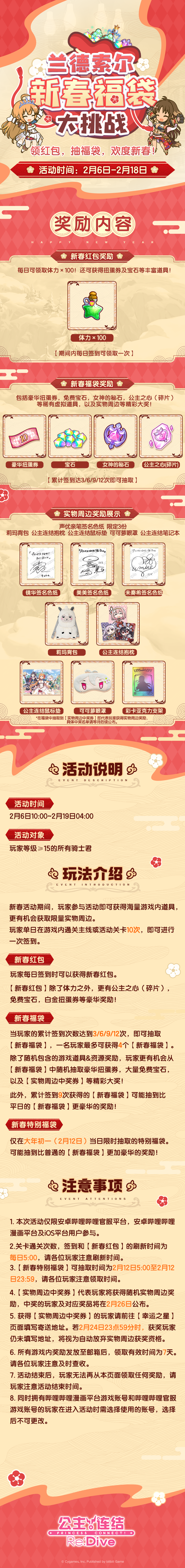 3.【新春特别福袋】可抽取时间为2月12日5:00至2月12日23:59,请各位玩家注意领取时间。