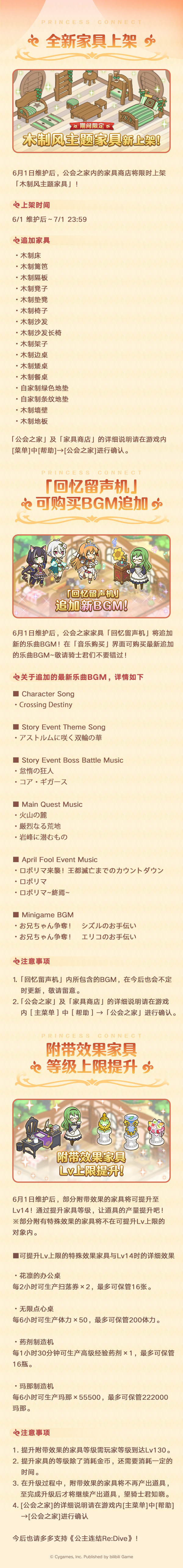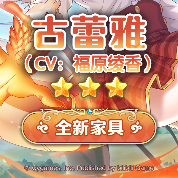 6月1日更新后,新角色★3「古蕾雅」(CV:福原绫香)即将登场!游戏内将同时开启「古蕾雅」 PICK UP扭蛋活动,开启★3必得白金扭蛋;公会之家将限时上架「木制风主题」家具,回忆留声机将追加新的BGM,附带效果家具等级上限将进行提升;同时,还将追加新的游戏内容!