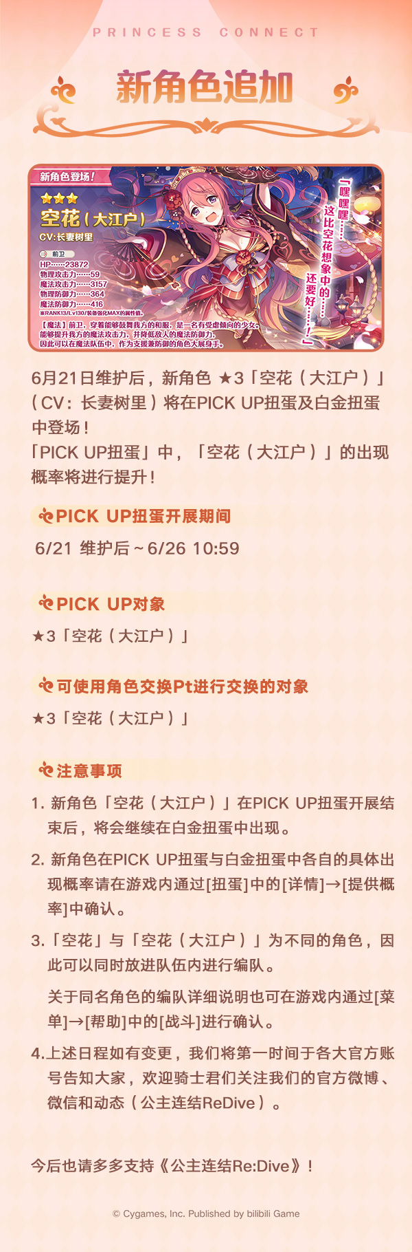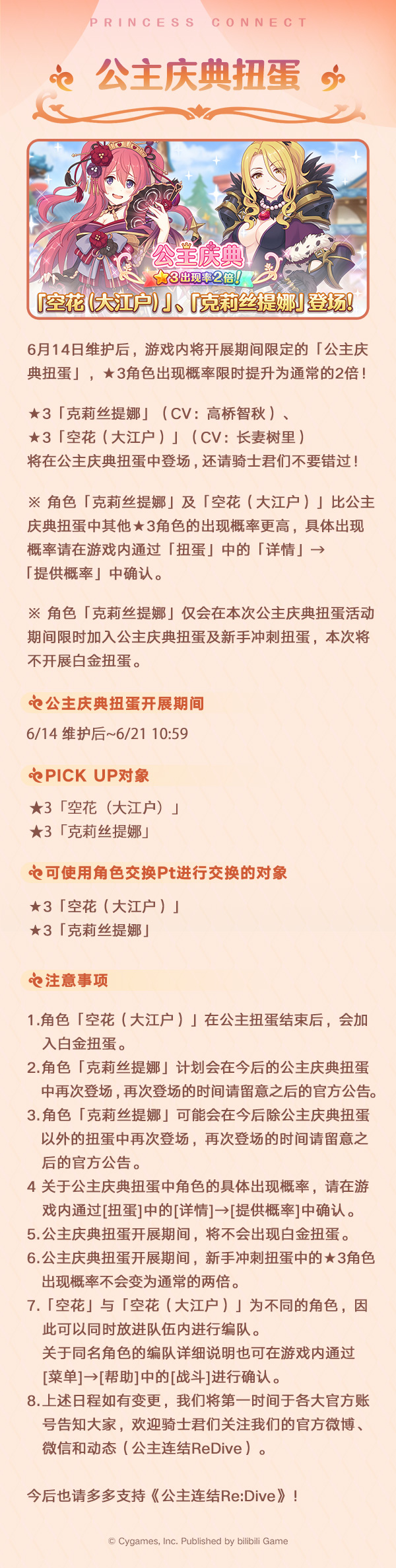 更新结束后,游戏内将开展★3角色出现率2倍的「公主庆典扭蛋」,新角色★3「空花(大江户)」(CV:长妻树里)及公主庆典限定角色★3「克莉丝提娜」将在「公主庆典扭蛋」中限时登场;同时,公会之家将上架端午节限定家具;还将追加新的角色专用装备!