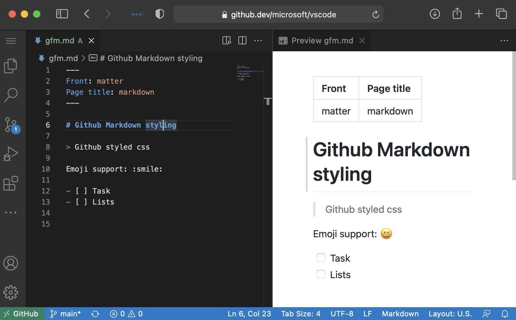 Change VSCode's built-in #markdown preview to match Github's styling. It also adds support for :emoji: and task lists